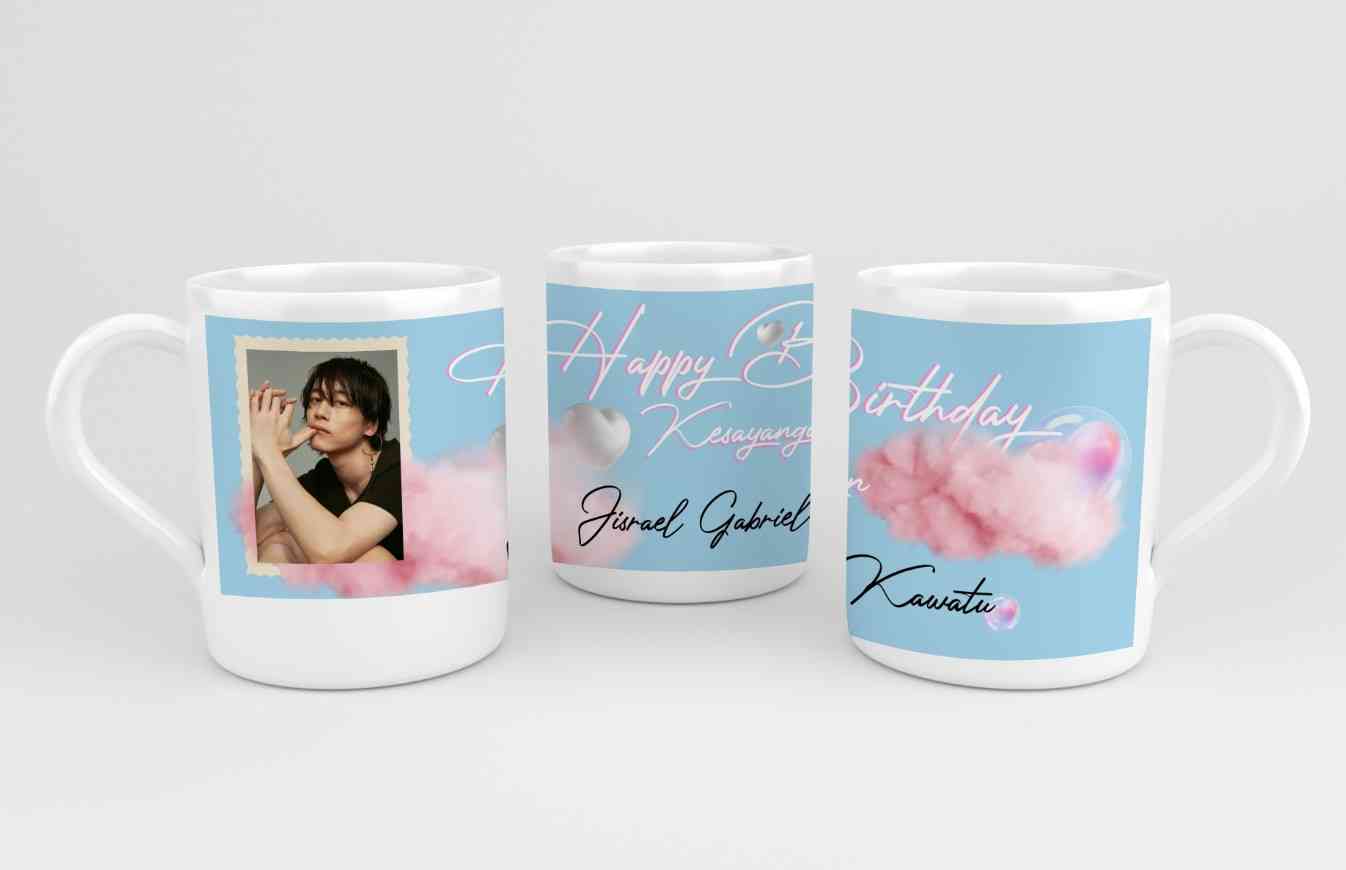 Desain mug ini bertemakan ulang tahun dengan nuansa lembut dan romantis. Latar belakang biru muda dipadukan dengan elemen awan pink dan bubble transpa...