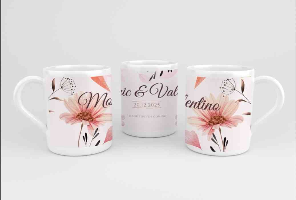 Desain mug ini menampilkan gaya artistik watercolor dengan nuansa natural yang hangat dan romantis. Kombinasi bunga mawar merah marun, dedaunan tropis hijau, dan latar krem bernoda percikan cat air menciptakan kesan handmade yang elegan. Tulisan "Wedding Of Monicha & Valentino" ditulis dengan kombinasi font script dan bold, memberikan kesan personal dan menonjol. Di bawahnya terdapat tanggal “25 Desember 2025” dalam gaya tulisan tangan yang lembut. Komposisi visual ini sangat cocok diaplikasikan sebagai desain mug souvenir pernikahan bertema rustic, tropical, atau natural dengan sentuhan artistik yang menenangkan dan estetik.