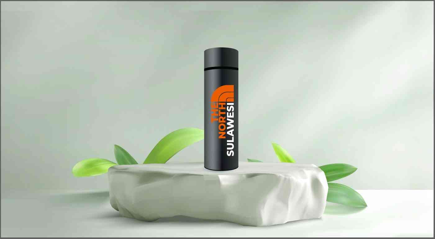 Desain ini menampilkan konsep personalisasi pada botol termos berwarna biru tua dengan tampilan yang modern dan minimalis.Nama PersonalTeks "REZA" dil...