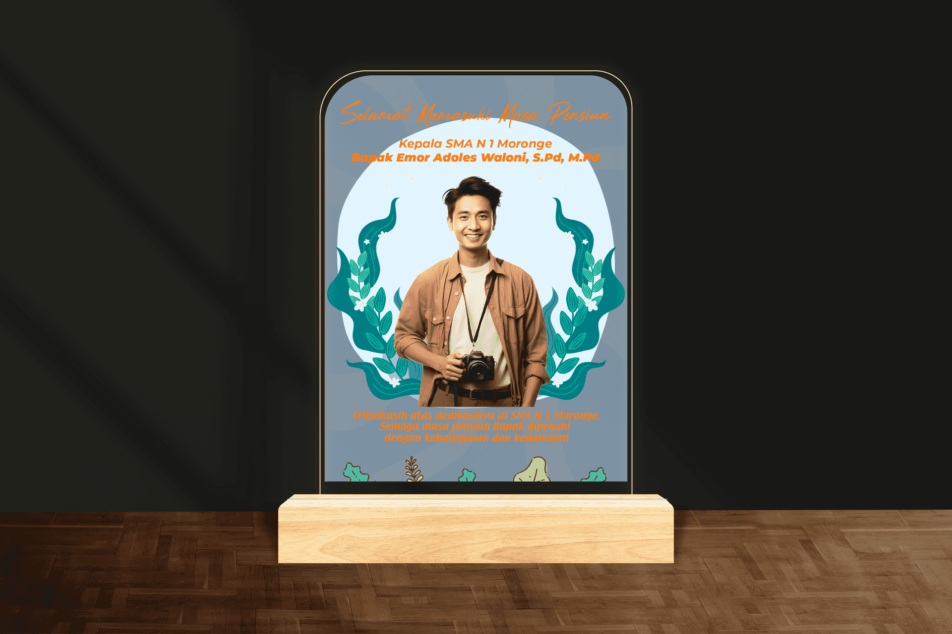 Gambar ini menampilkan sebuah papan ucapan yang dirancang dengan estetika modern dan elegan. Papan ini berisi pesan penghormatan untuk seorang kepala...