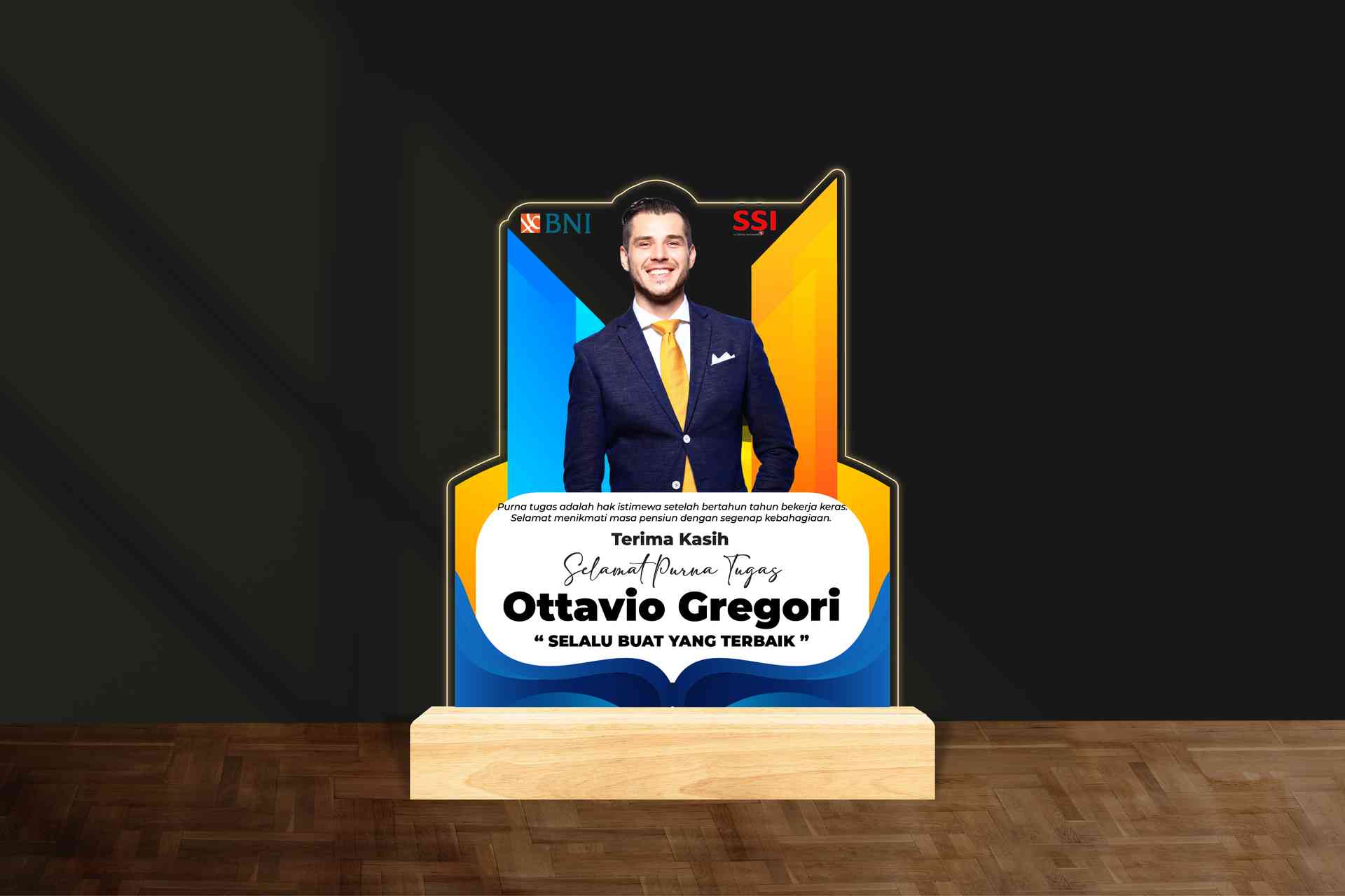 Gambar ini menampilkan sebuah papan penghormatan untuk purna tugas seseorang bernama Ottavio Gregori. Desainnya terlihat modern dan profesional, denga...