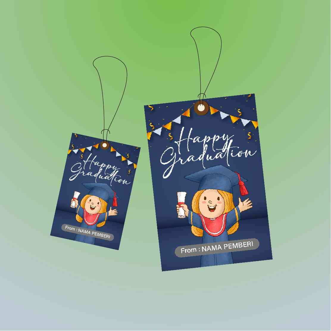 Hangtag bertema kelulusan ini menampilkan tumpukan buku yang dihiasi dengan topi toga berwarna biru tua sebagai simbol pencapaian akademis. Latar bela...