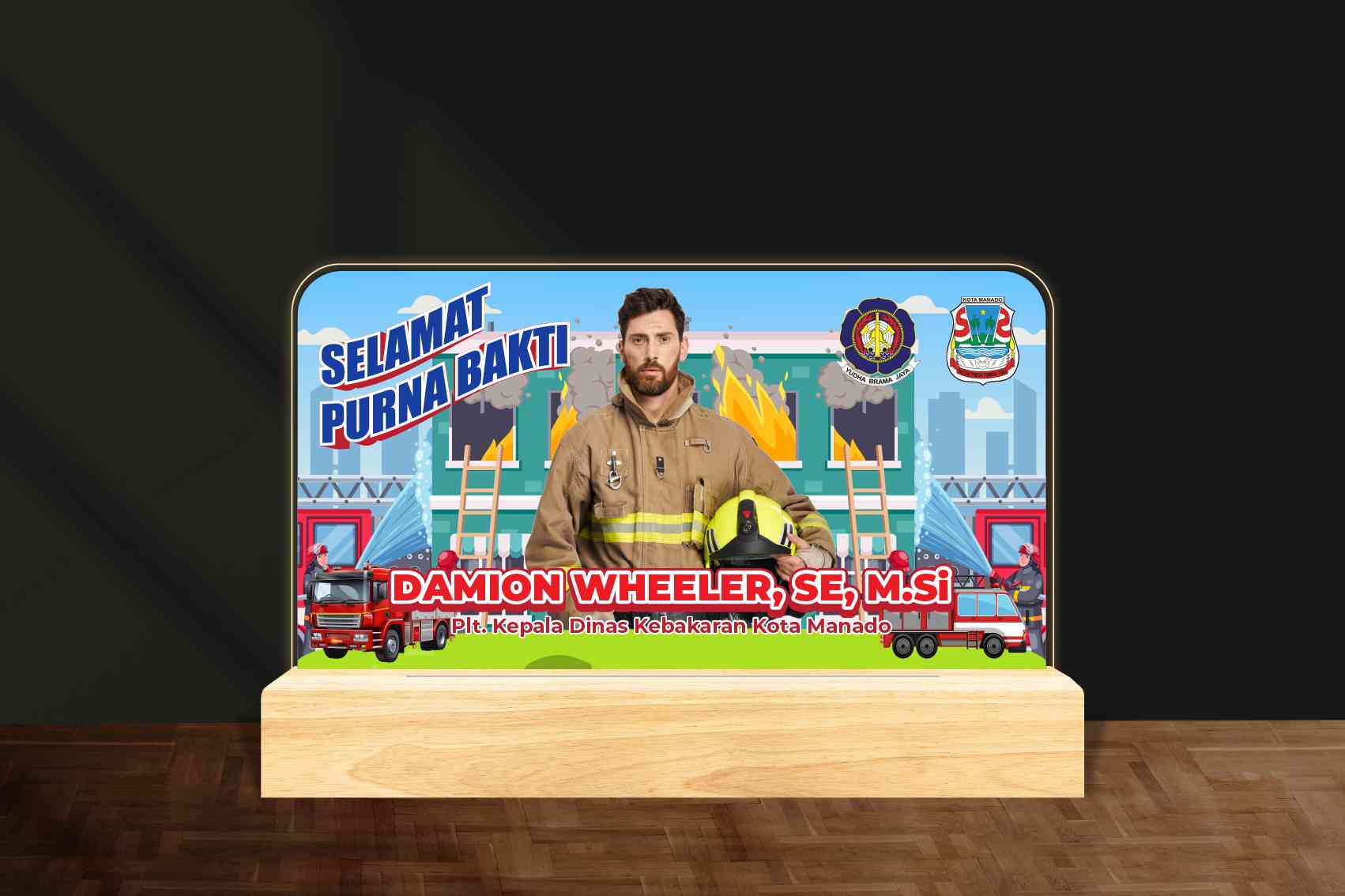Gambar ini menampilkan desain plakat penghargaan purna bakti untuk seorang pejabat pemadam kebakaran. Di bagian tengah, terdapat seorang pria dengan s...