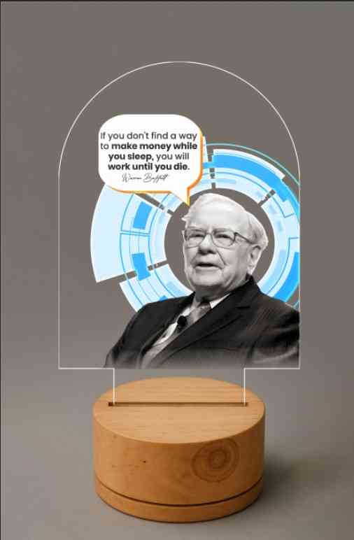 Desain Dream LED ini menampilkan foto tokoh inspiratif Warren Buffett dalam nuansa grayscale dengan latar belakang digital futuristic berwarna biru mu...
