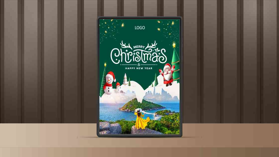 Slim Led Poster Event Natal Warna Hijau merupakan poster LED tipis berbentuk persegi panjang vertikal dengan dominasi warna hijau, menampilkan desain...