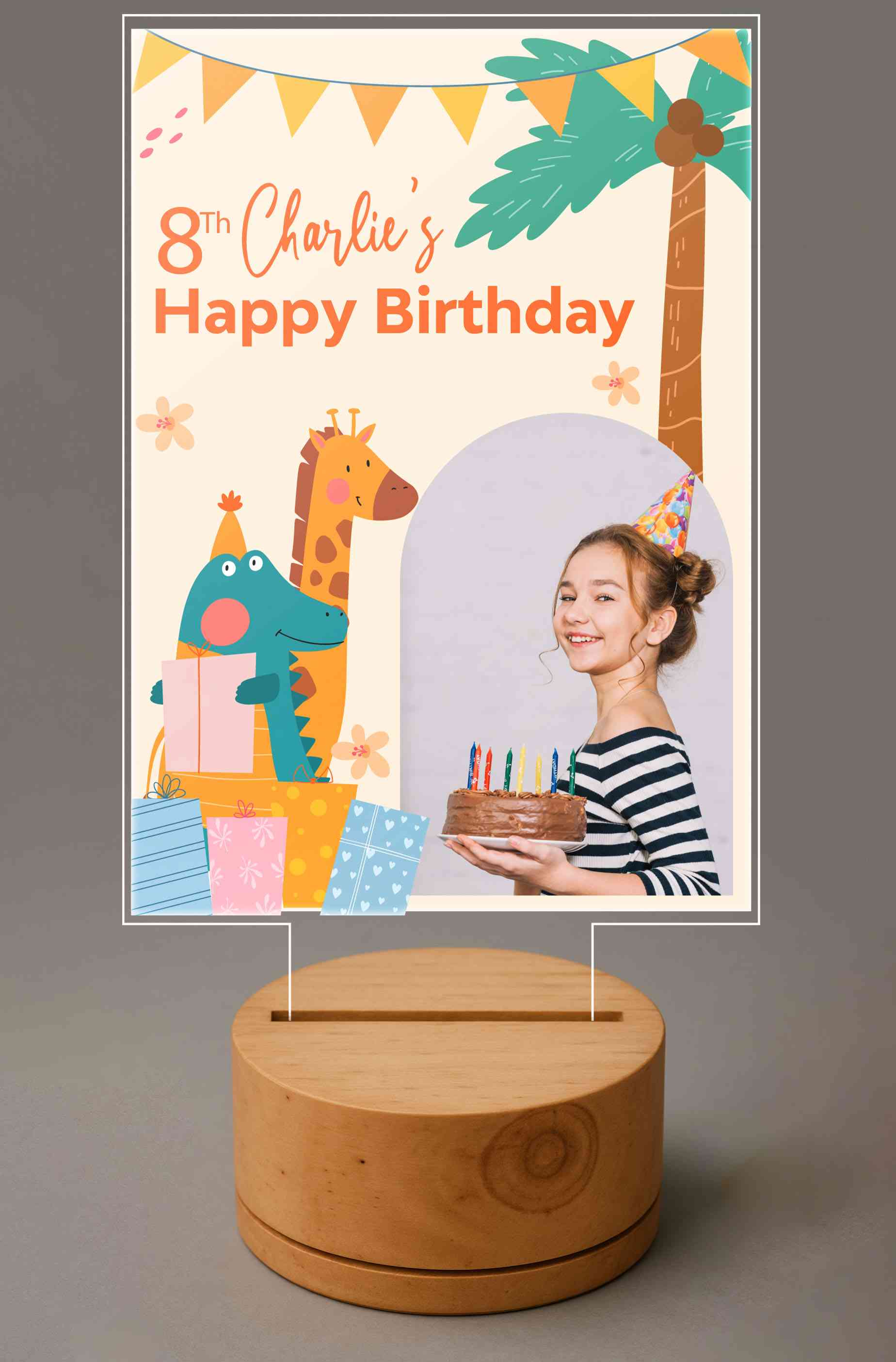 Dream LED birthday ini hadir dengan desain penuh warna dan keceriaan, menampilkan tema hewan lucu seperti giraffe dan buaya dengan topi pesta, ditamba...