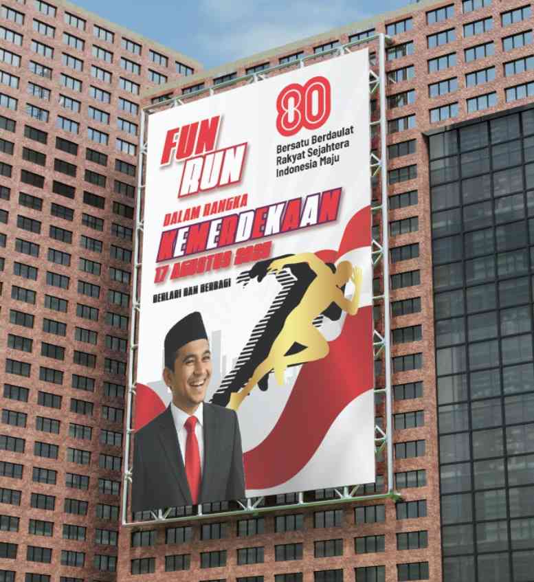 Baliho berukuran besar ini mempromosikan acara Fun Run Kemerdekaan untuk memperingati 80 Tahun Indonesia, didominasi warna merah, putih, dan emas yang...
