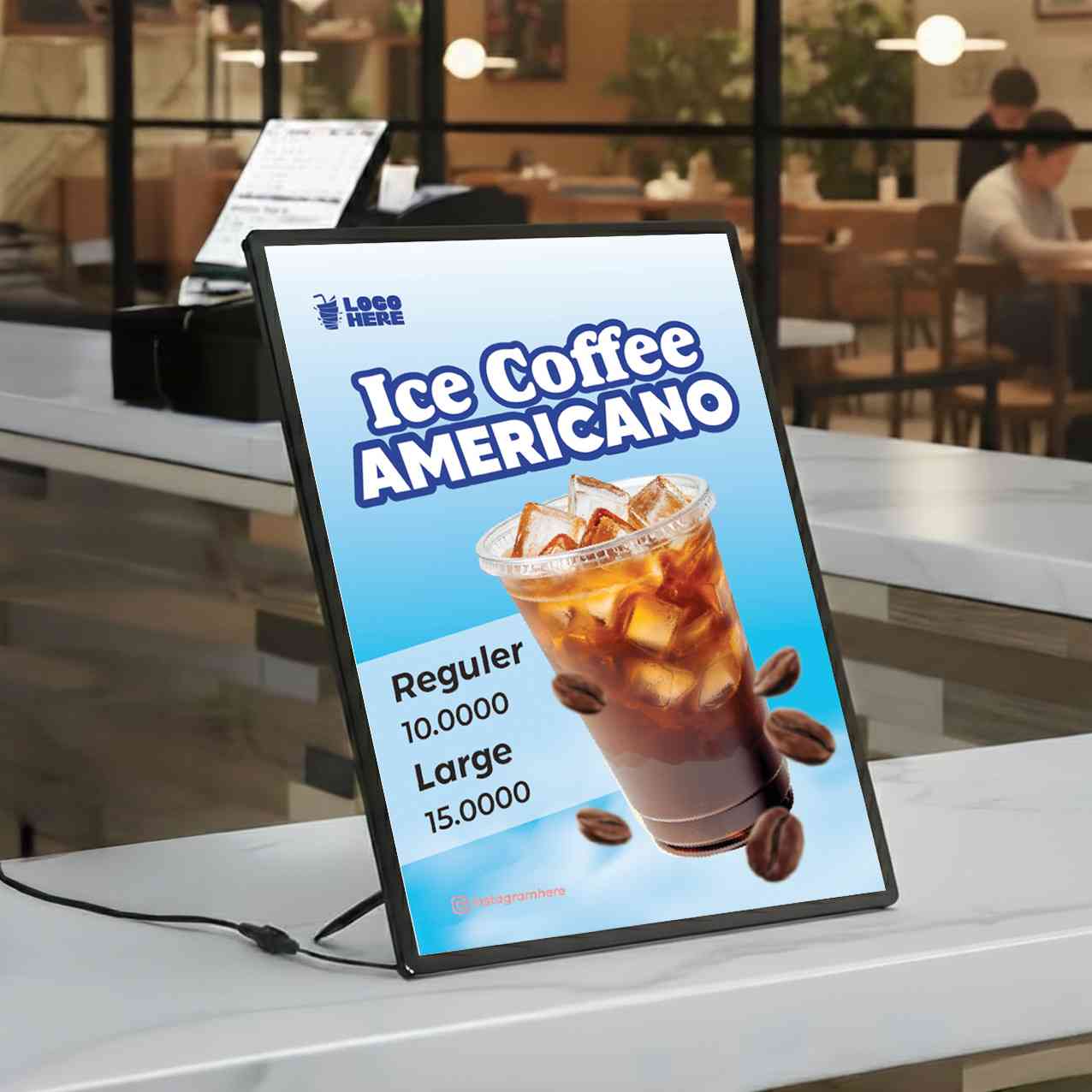 Slim LED Menu Minuman Ice Coffee Americano tampil dalam bentuk papan menu ramping dengan penerangan LED, memajang visual minuman es kopi Americano dal...