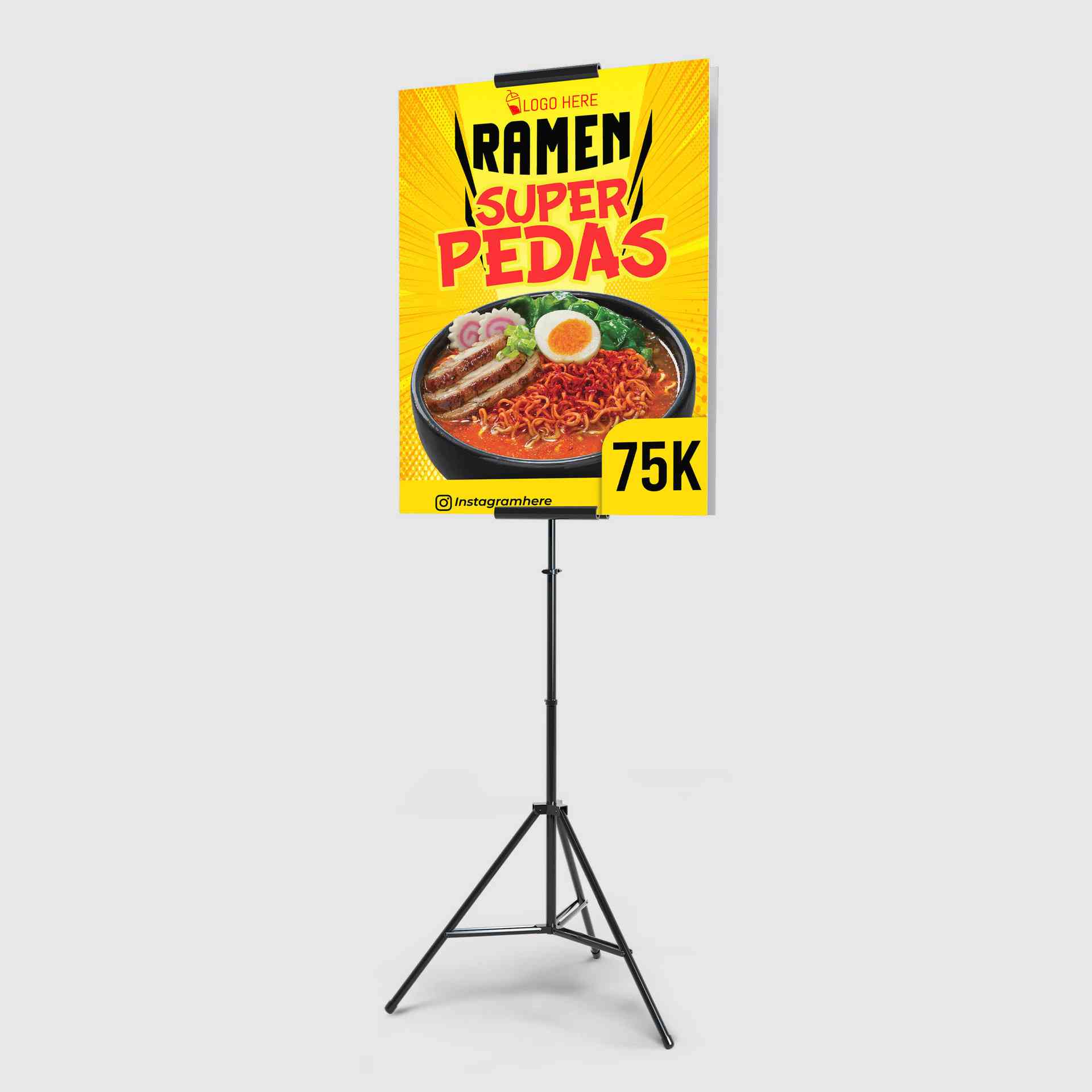Foamboard promosi makanan ramen pedas berbentuk persegi panjang dengan warna dominan kuning cerah, menampilkan ilustrasi semangkuk ramen lengkap denga...