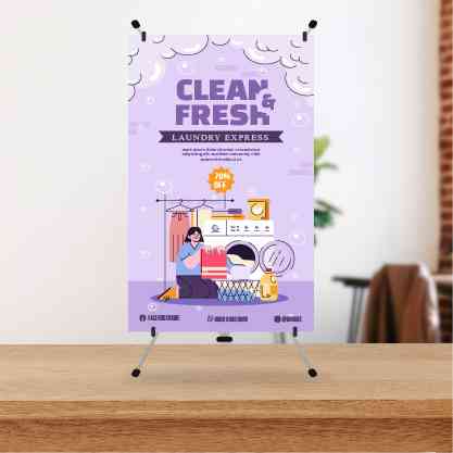Mini standing banner ini menampilkan bentuk vertikal dengan dominasi warna ungu muda, didesain secara clean dengan tipografi besar bertuliskan “CLEAN...
