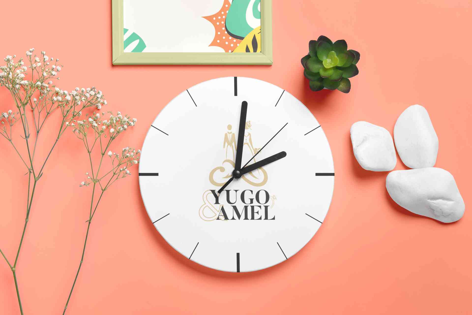 Desain jam ini mengusung konsep minimalis dan elegan sebagai suvenir pernikahan. Dengan latar belakang putih bersih, desain menampilkan inisial pasang...