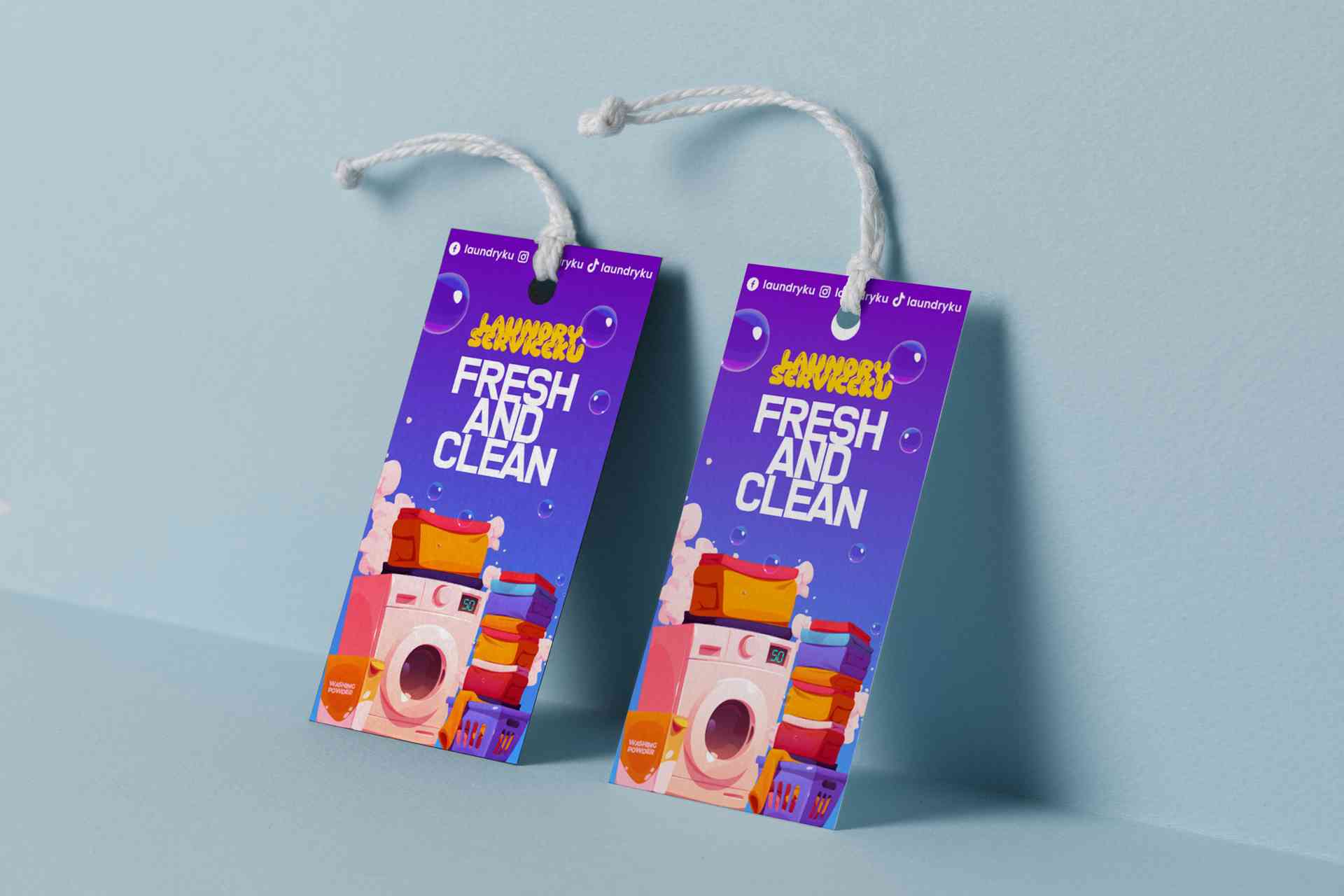 Hang tag ini menampilkan desain yang penuh warna dan energi dengan tema "Fresh and Clean" yang sangat cocok untuk bisnis laundry kekinian. Latar belak...