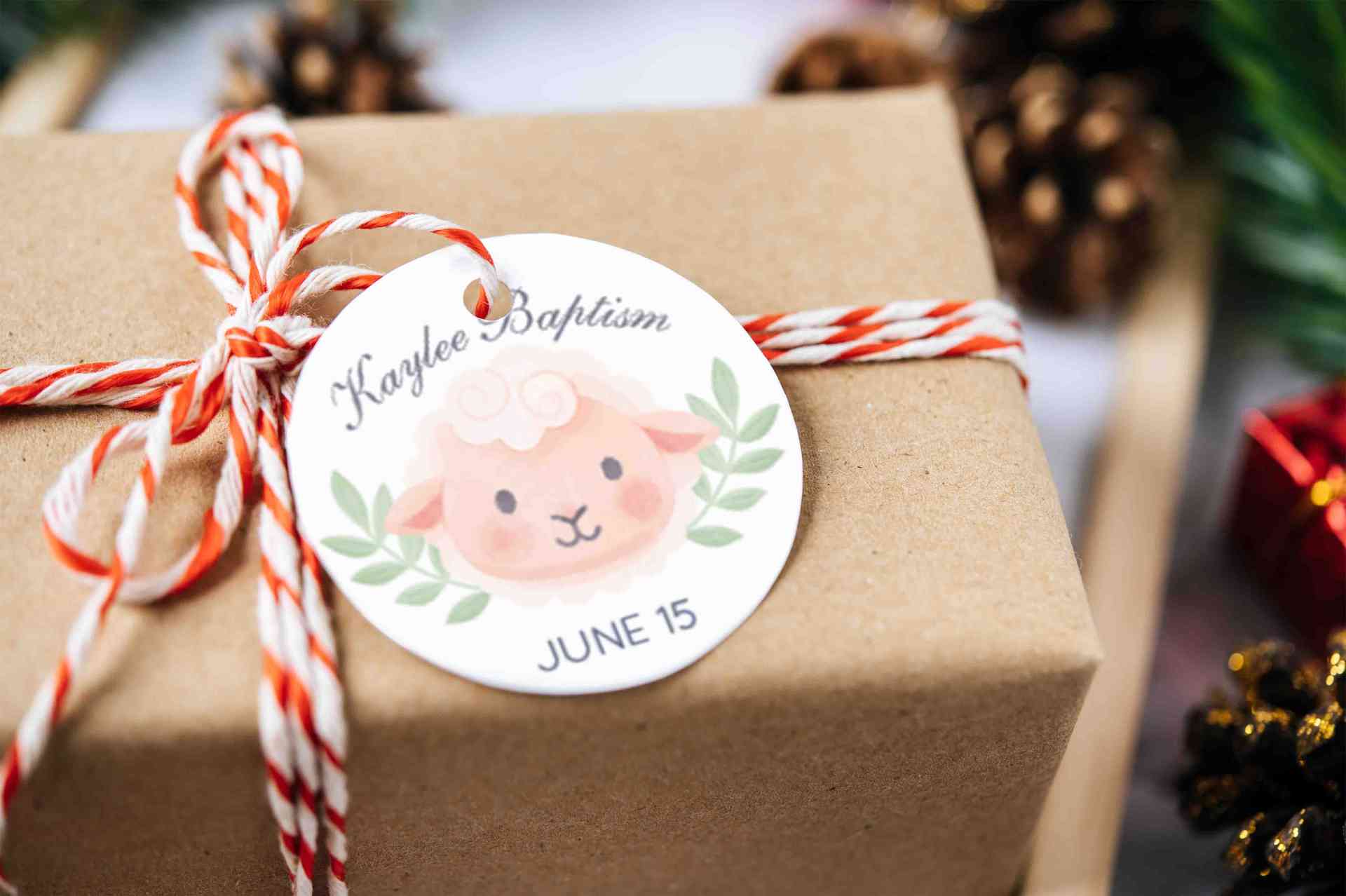 Hang tag ini dibuat khusus untuk acara baptisan anak perempuan, menampilkan ilustrasi domba lucu bergaya watercolor dengan pipi merah muda dan ekspres...