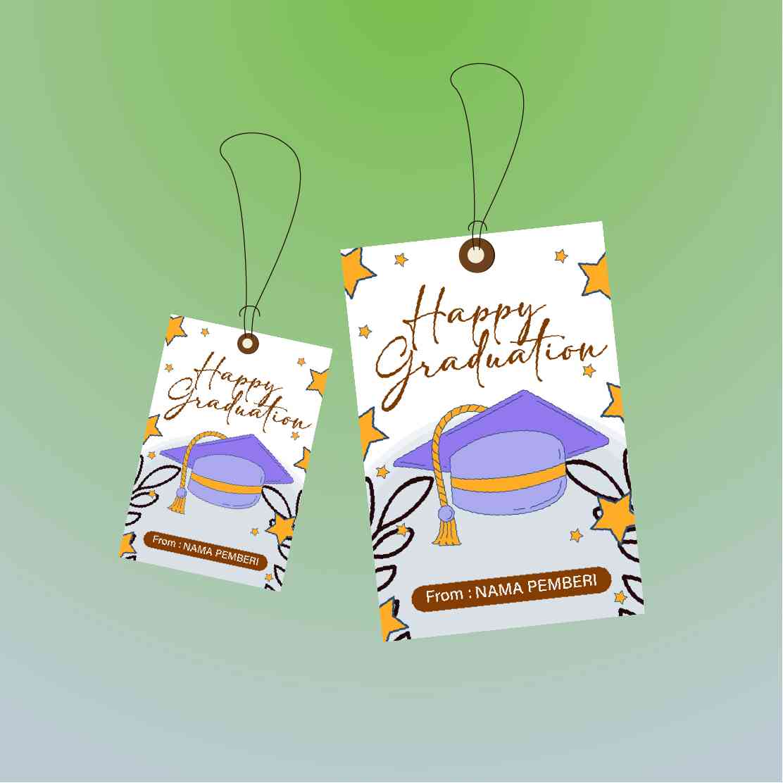 Hangtag ini menampilkan desain elegan dengan topi wisuda ungu yang diletakkan di atas tumpukan buku warna-warni, memberi kesan akademik dan penuh sema...