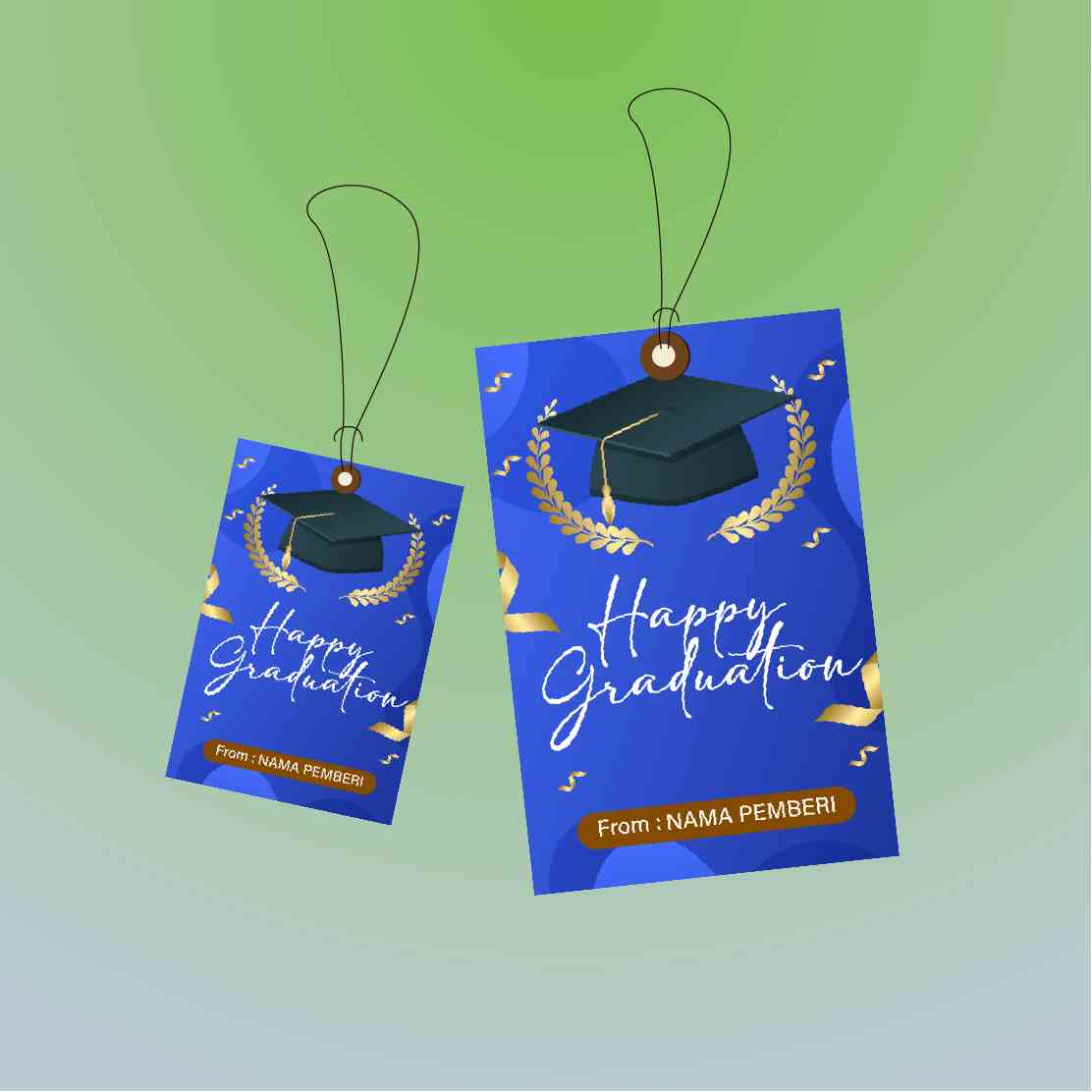Hangtag berdesain elegan dengan dominasi warna biru royal dan aksen pita emas, menampilkan topi toga sebagai simbol kelulusan. Desain ini ideal untuk...