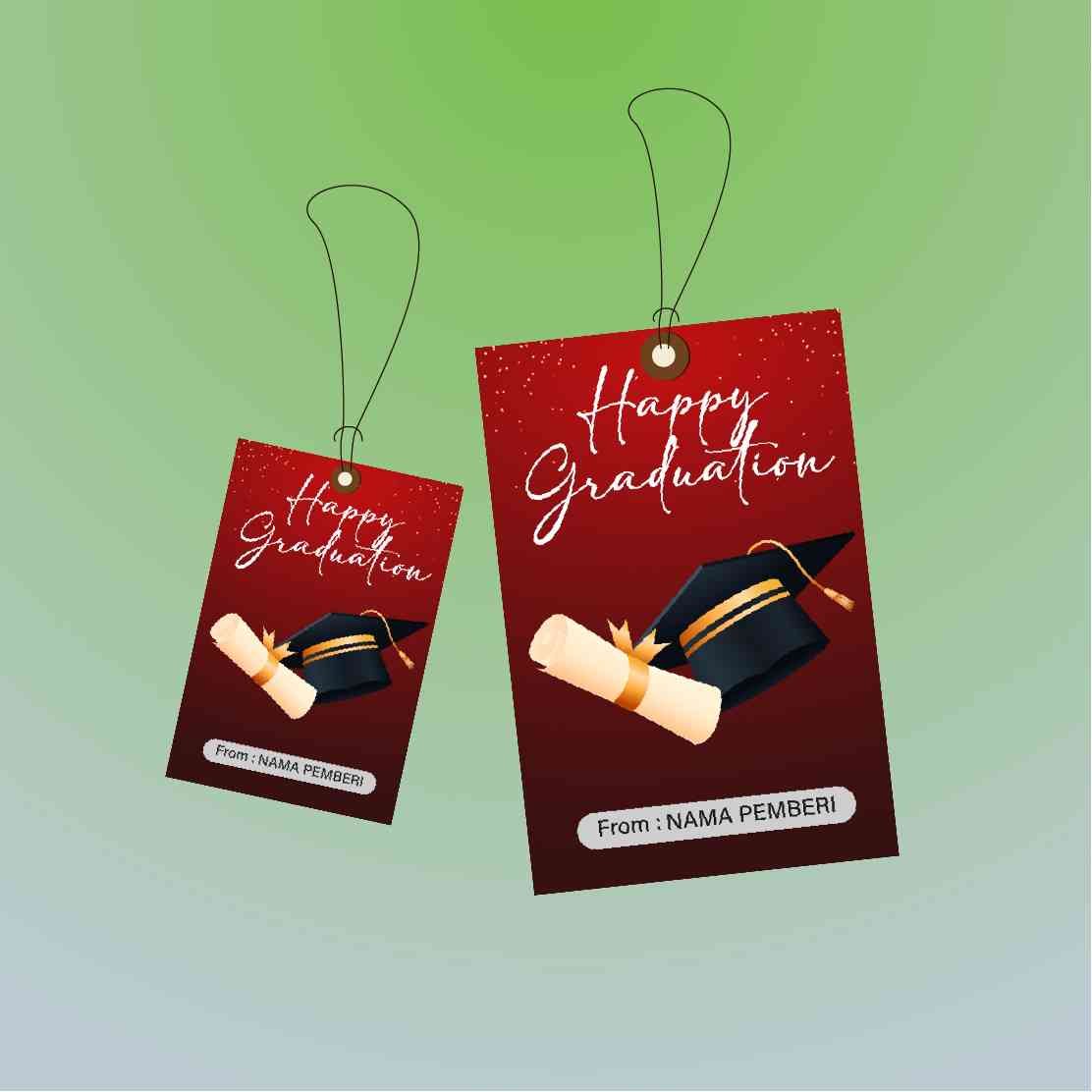 Desain elegan dengan latar marun gelap, dihiasi topi toga dan gulungan ijazah, menjadikan hangtag ini sangat pas untuk acara wisuda. Warna intens menc...