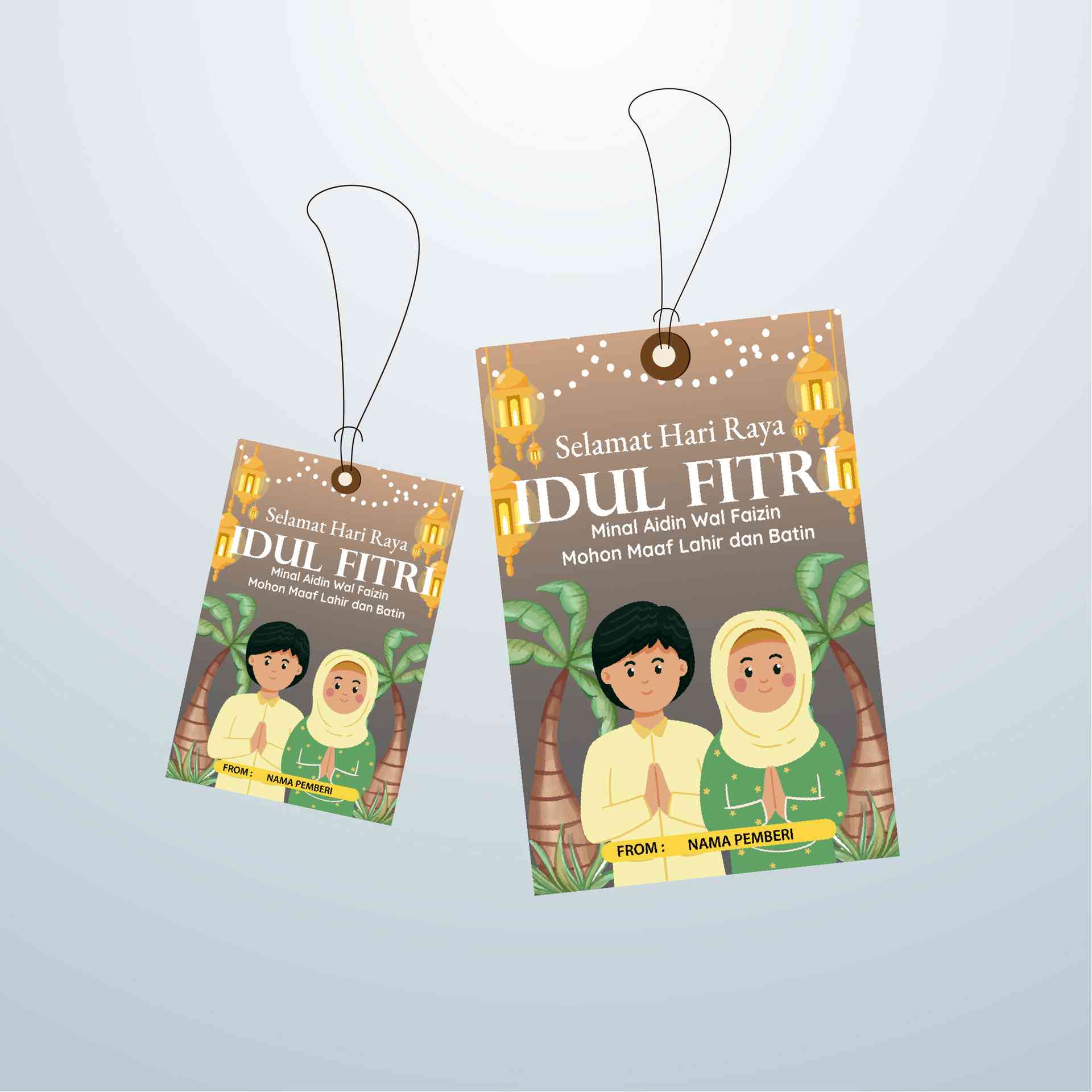 Hangtag Idul Fitri dengan ilustrasi pasangan muslim pria dan wanita yang sedang mengucapkan salam dan maaf lahir batin, menciptakan kesan hangat dan p...