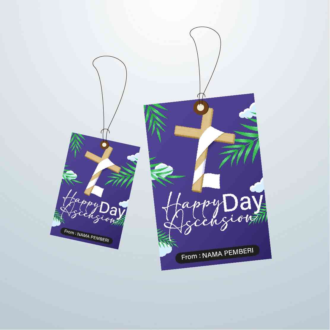 Hangtag ini menggambarkan suasana khusyuk dan damai dari peristiwa Kenaikan Yesus, dengan salib kayu yang dililit kain putih sebagai simbol kemenangan...