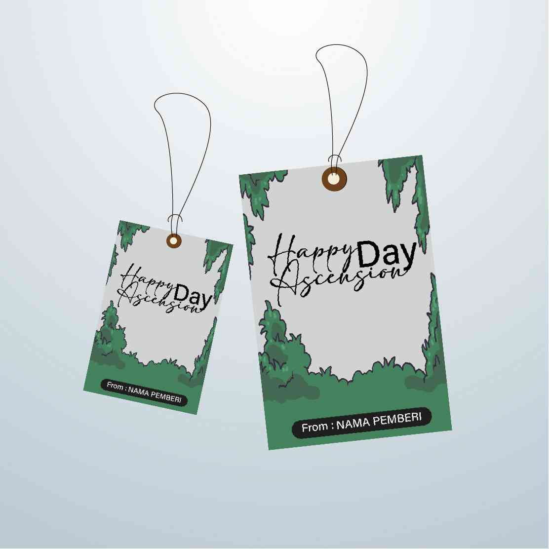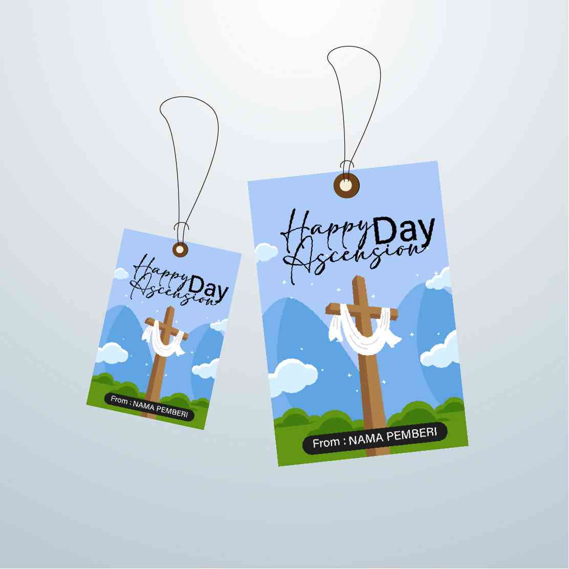 Hangtag ini menghadirkan siluet hijau Tuhan Yesus yang sedang naik ke langit, dikelilingi awan-awan putih di latar pink yang cerah. Desainnya menonjol...