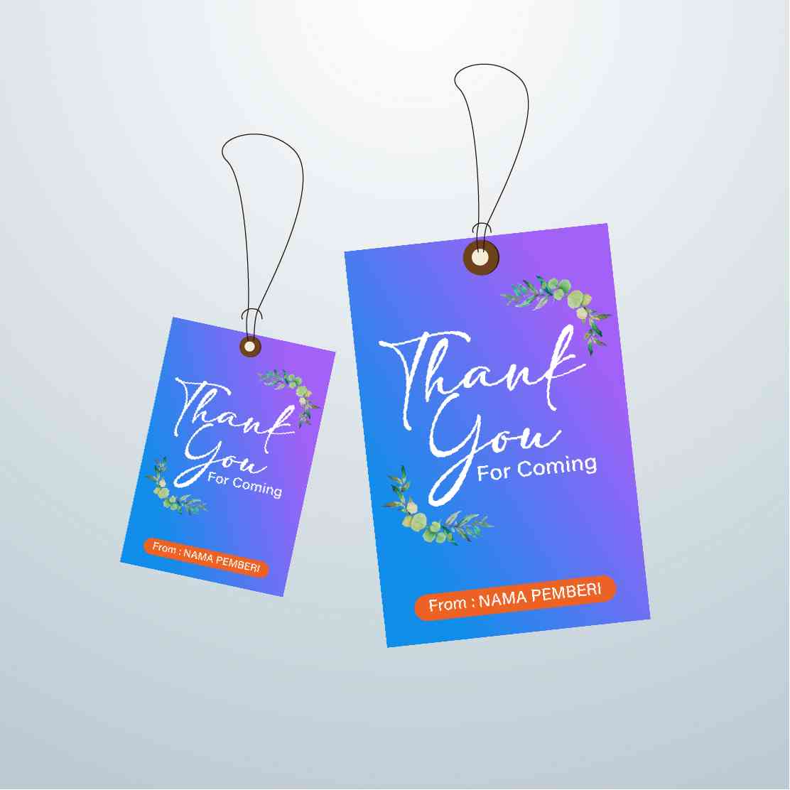 Desain hangtag dengan latar gradasi ungu biru yang menawan ini dihiasi daun-daun kecil di sudut atas dan bawah. Memberikan kesan ceria namun tetap rap...