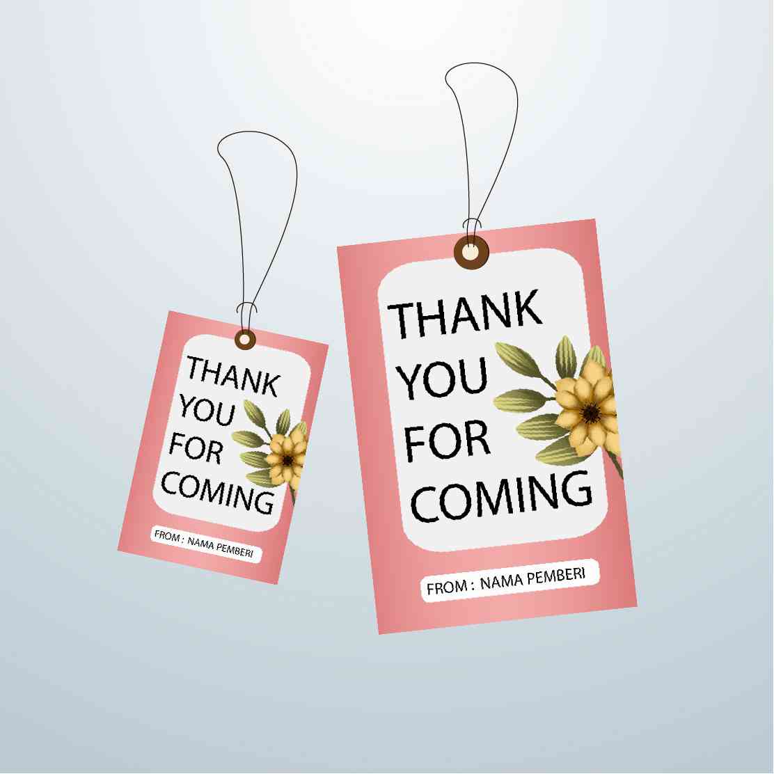 Hangtag ini memiliki desain simpel namun elegan dengan tulisan "THANK YOU FOR COMING" di tengah, dikelilingi oleh bunga kuning yang manis di sisi kana...