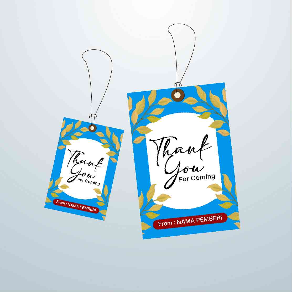 Desain hangtag ini tampil memikat dengan kombinasi warna biru terang dan aksen dedaunan emas yang mengelilingi bagian tengah, menciptakan kesan mewah...