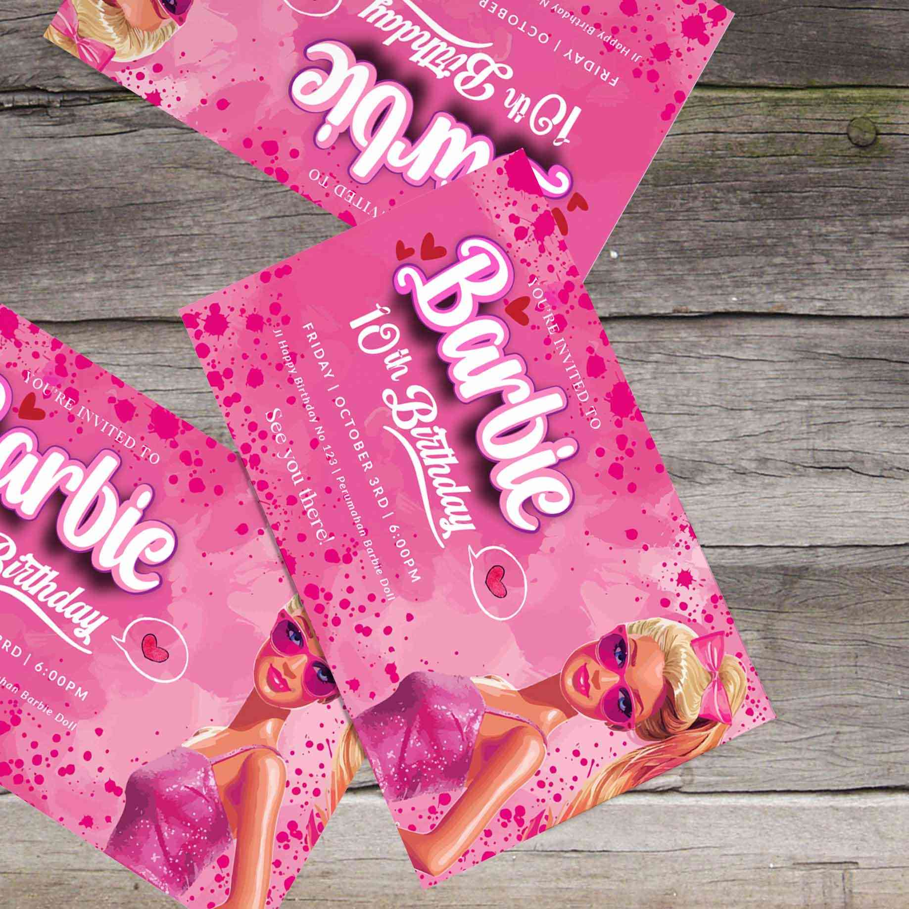 Undangan ulang tahun ini didesain dengan tema Barbie yang feminin dan penuh glamor, menampilkan latar belakang pink glitter yang memancarkan kesan mew...