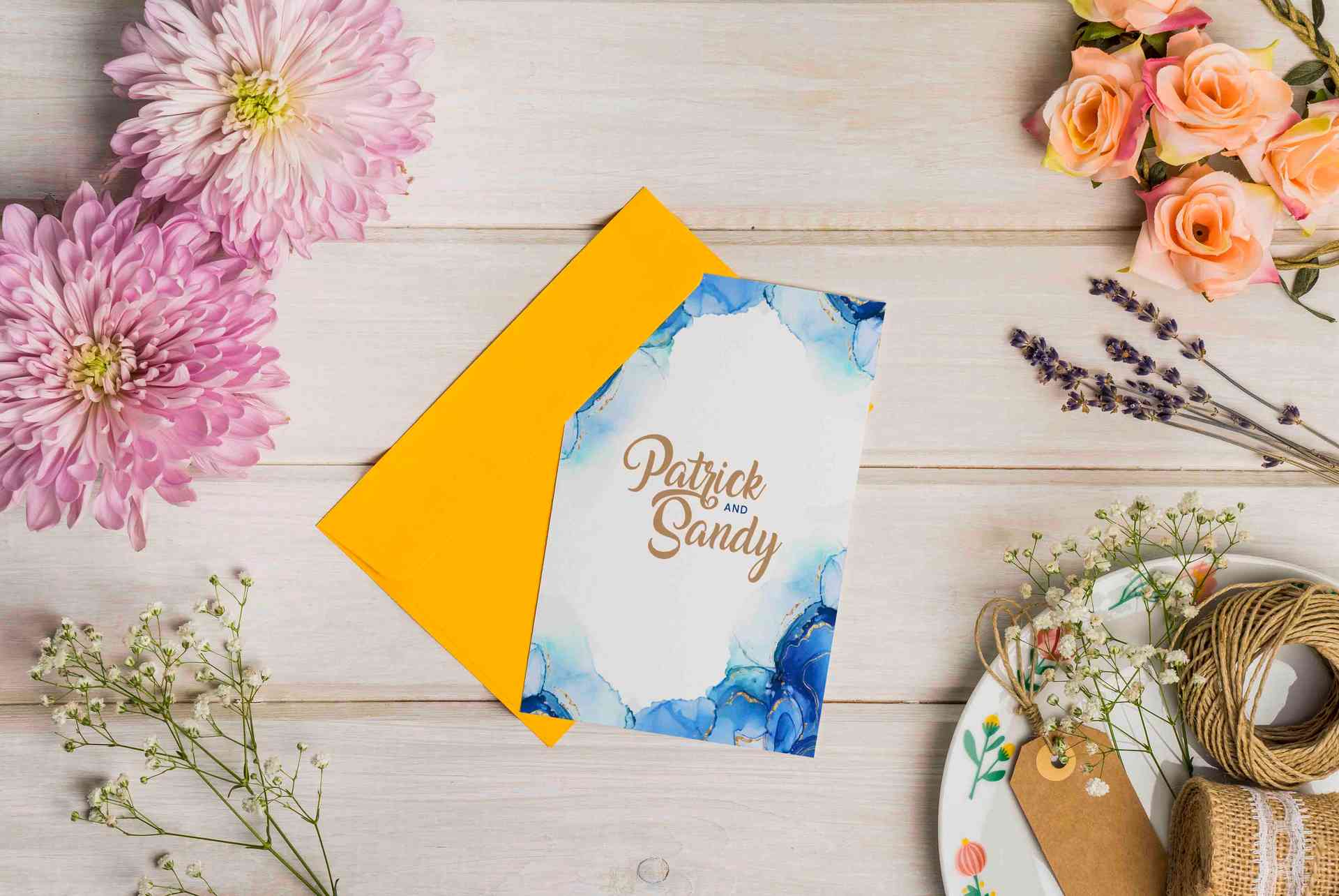 Undangan Pernikahan Nuansa Marmer Blue Gold ini berbentuk persegi panjang dengan tampilan elegan yang menonjolkan karakter visual marmer biru dengan a...