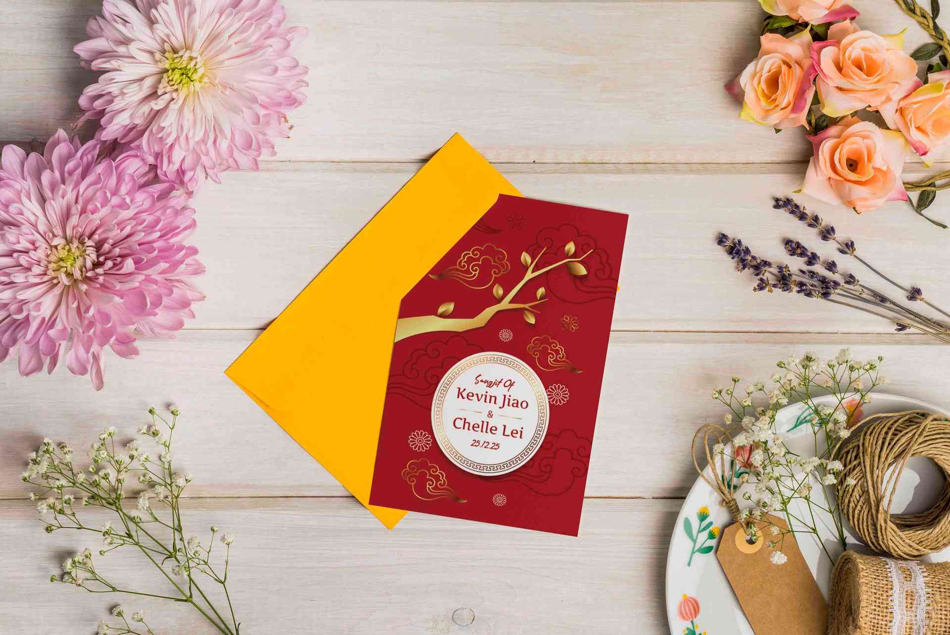Undangan Pernikahan Elegan Merah Oriental berbentuk persegi panjang dengan dominasi warna merah marun dan aksen emas. Tampilan visualnya menonjolkan o...