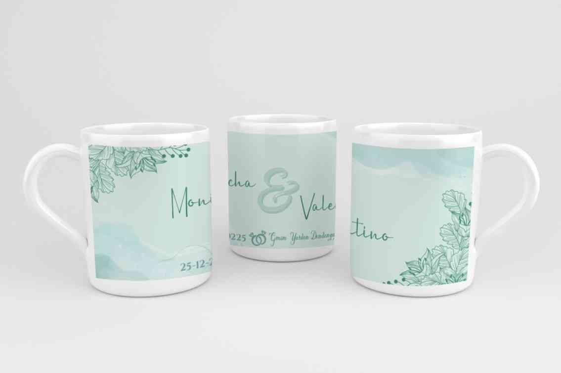 Desain mug bertema pernikahan dengan nuansa hijau mint yang menenangkan. Ornamen dedaunan garis tipis menghiasi bagian kanan dan kiri, memberikan sent...