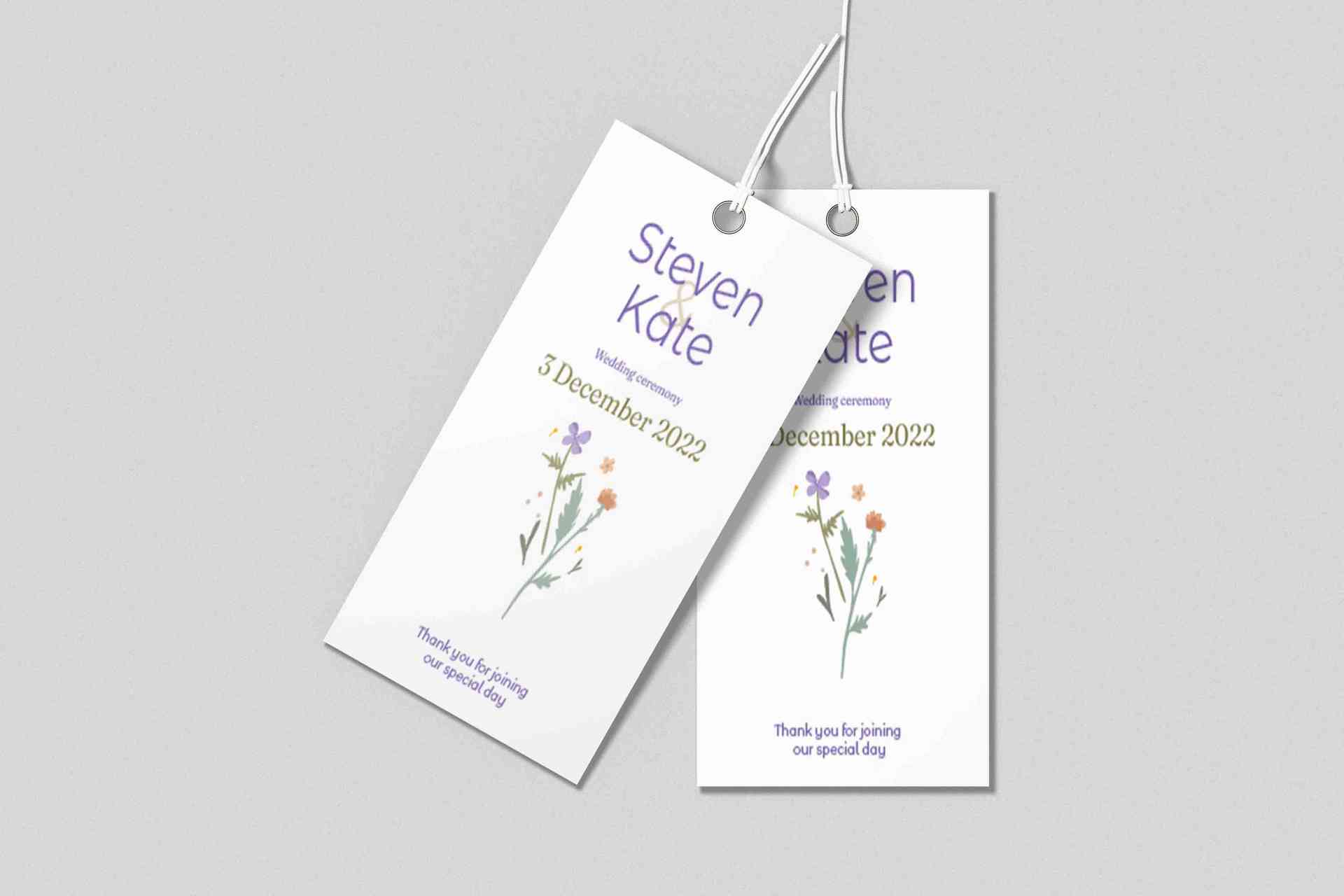 Hangtag ini menampilkan desain yang bersih dan elegan dengan dominasi warna putih dan sentuhan teks ungu serta emas. Ilustrasi bunga kecil di tengah b...