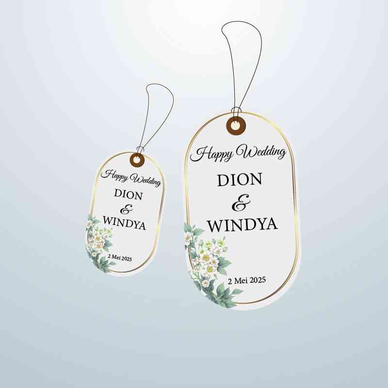 Desain label pernikahan ini tampil elegan dan simpel dengan bentuk oval vertikal yang dilengkapi lubang tali di bagian atas, cocok dijadikan gantungan...