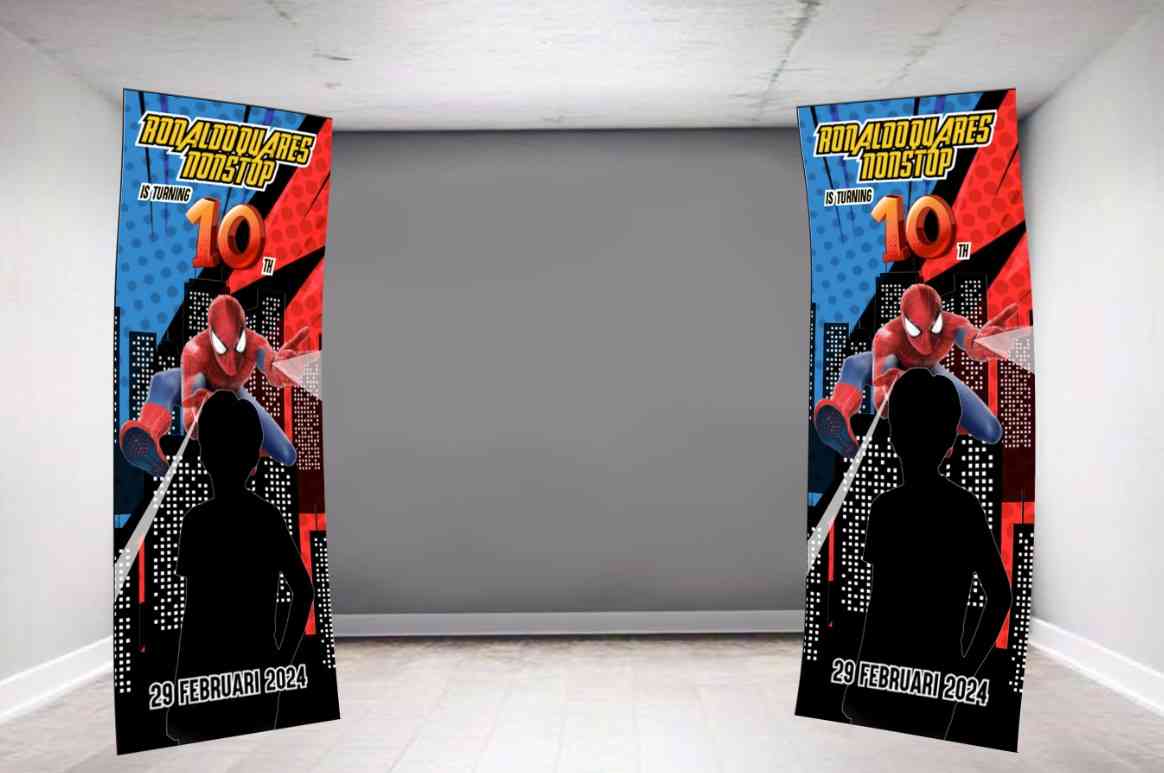 Banner ini berukuran 60x160 cm dengan tema superhero yang dominan, menampilkan ilustrasi Spiderman sebagai elemen utama di bagian tengah atas, seolah...