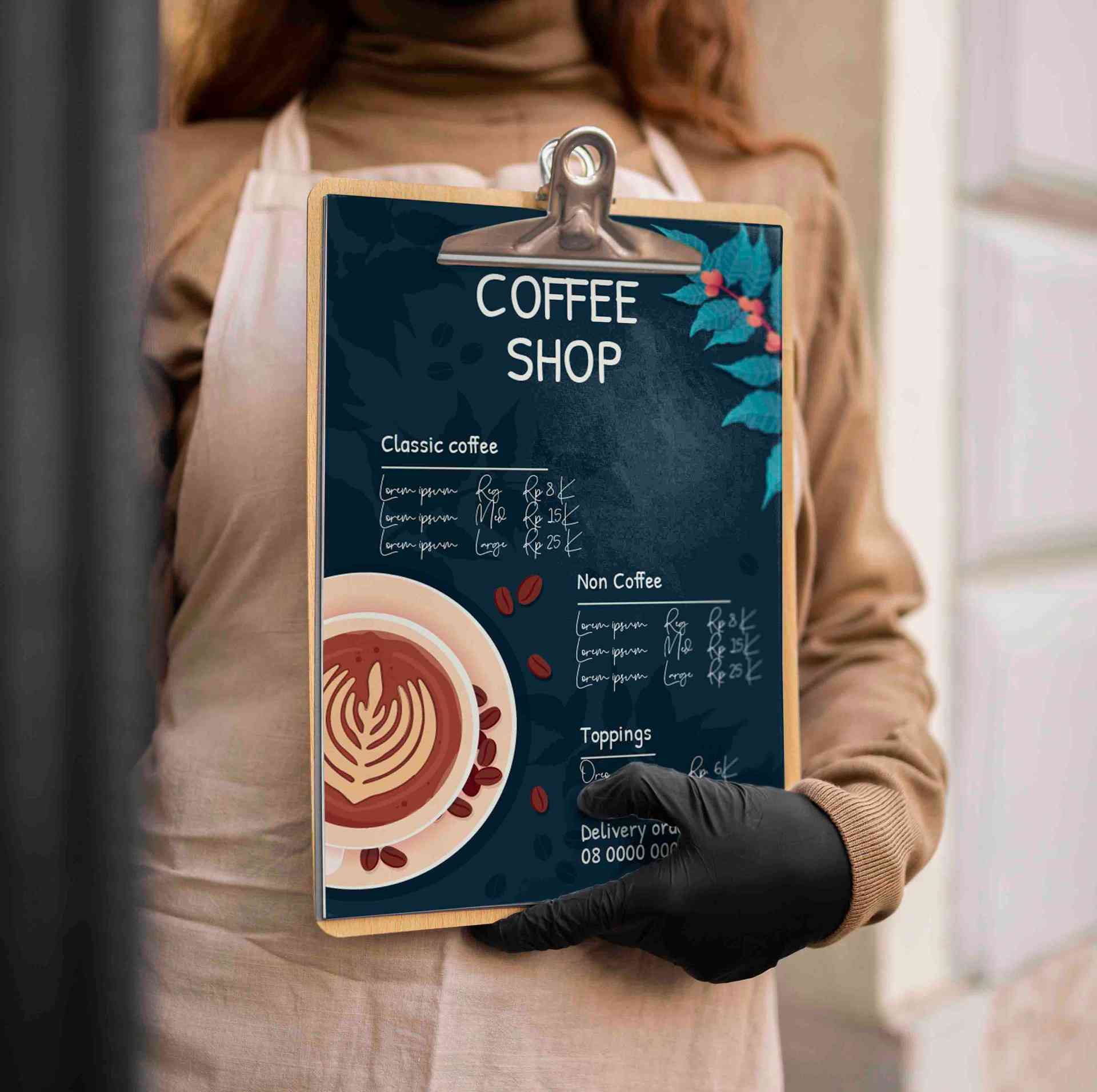 Menu minuman berjudul “Menu Minuman Coffee Nuansa Warna Biru” ini berbentuk lembaran datar dengan dominasi warna biru tua, menampilkan ilustrasi cangk...