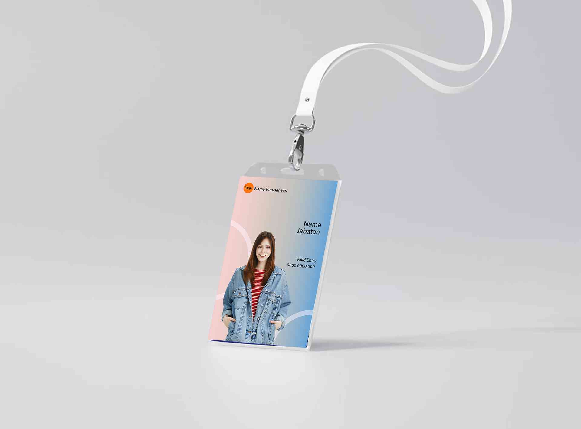 ID card berbentuk persegi panjang dengan desain gradasi warna pastel biru dan pink yang lembut, menampilkan karakter perempuan berpenampilan kasual pa...