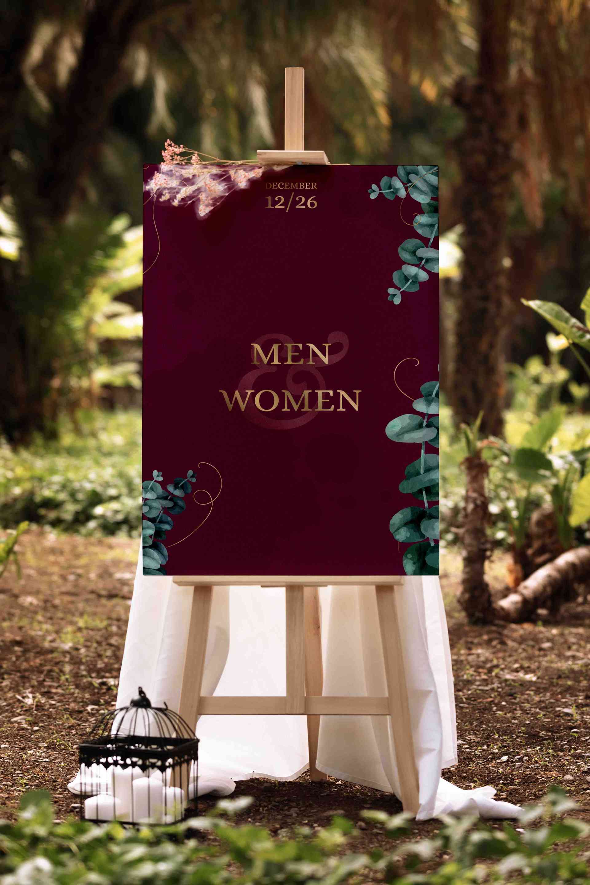 Wedding welcome sign berbentuk persegi panjang vertikal dengan warna dominan merah maroon, dihiasi elemen dedaunan hijau di beberapa sudutnya dan tipo...