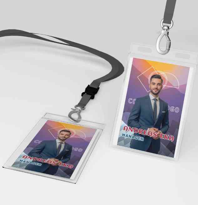 ID Card premium ini berbentuk persegi panjang vertikal dengan desain formal, menonjolkan karakter pria berpakaian jas dan dasi yang menambah kesan pro...