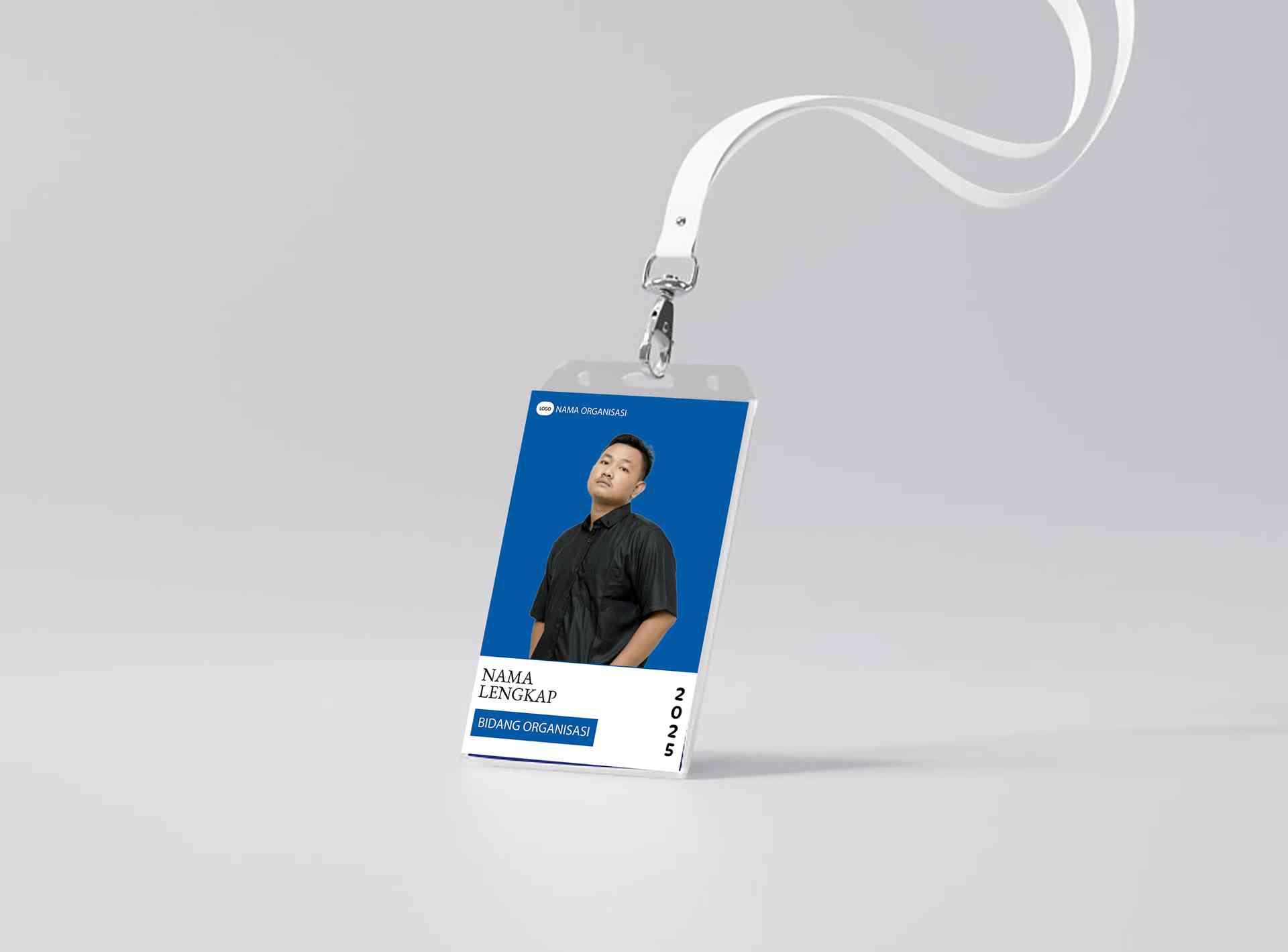 Desain ID card ini menampilkan konsep formal dengan warna biru elegan, dilengkapi foto full body setengah badan pada sisi kanan yang memberikan kesan...