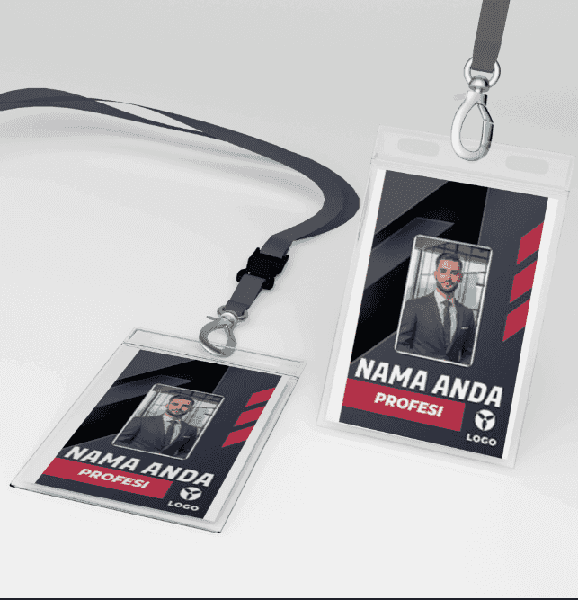 ID card berdesain merah dan hitam ini menonjolkan kesan elegan dan profesional, dengan tata letak tegas dan garis diagonal merah sebagai elemen desain...