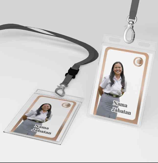 ID Card formal dengan desain dominan warna putih, cokelat, dan sentuhan emas menampilkan bingkai tegas di sekeliling foto pemilik kartu. Foto individu...