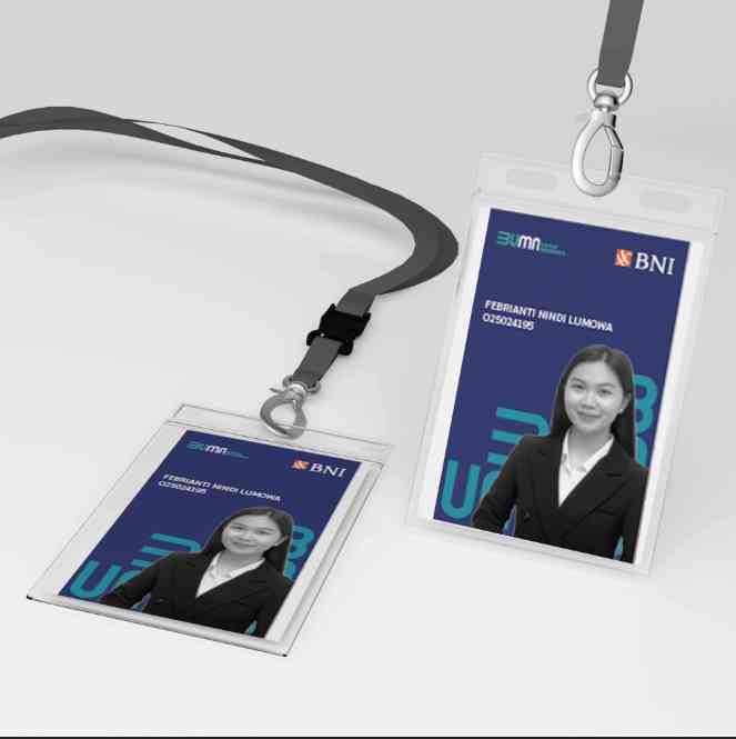 ID Card Profesional BUMN BNI bertema biru navy ini berbentuk persegi panjang vertikal dengan desain elegan dan profesional, menampilkan dominasi warna...