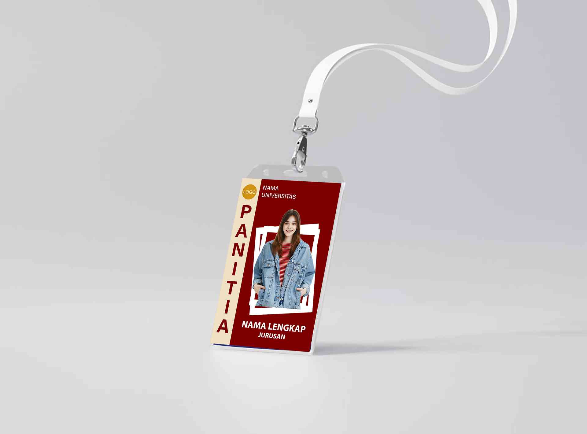 ID Card panitia mahasiswa berbentuk persegi panjang dengan desain elegan bernuansa merah maroon dan aksen krem pada sisi kiri bertuliskan "PANITIA" ve...
