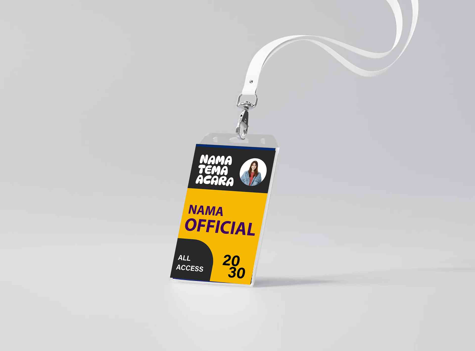 ID Card untuk keperluan team official acara ini berbentuk persegi panjang vertikal dengan sudut membulat, menampilkan desain profesional dan identitas...