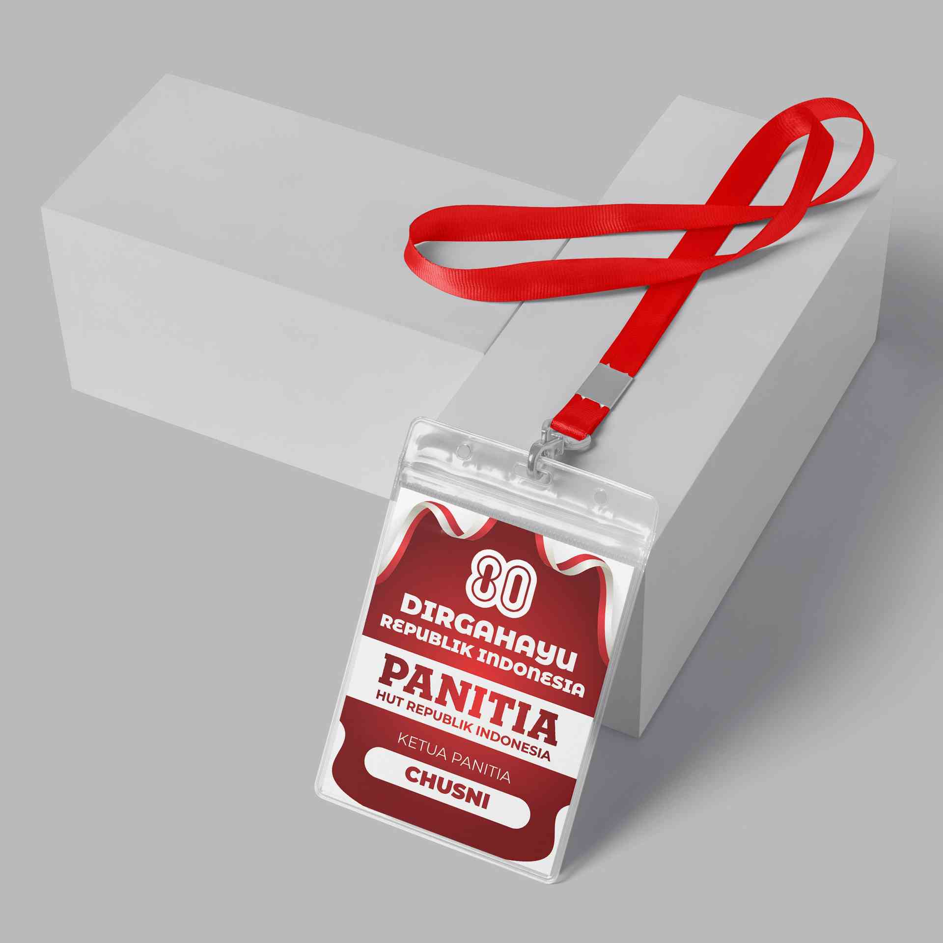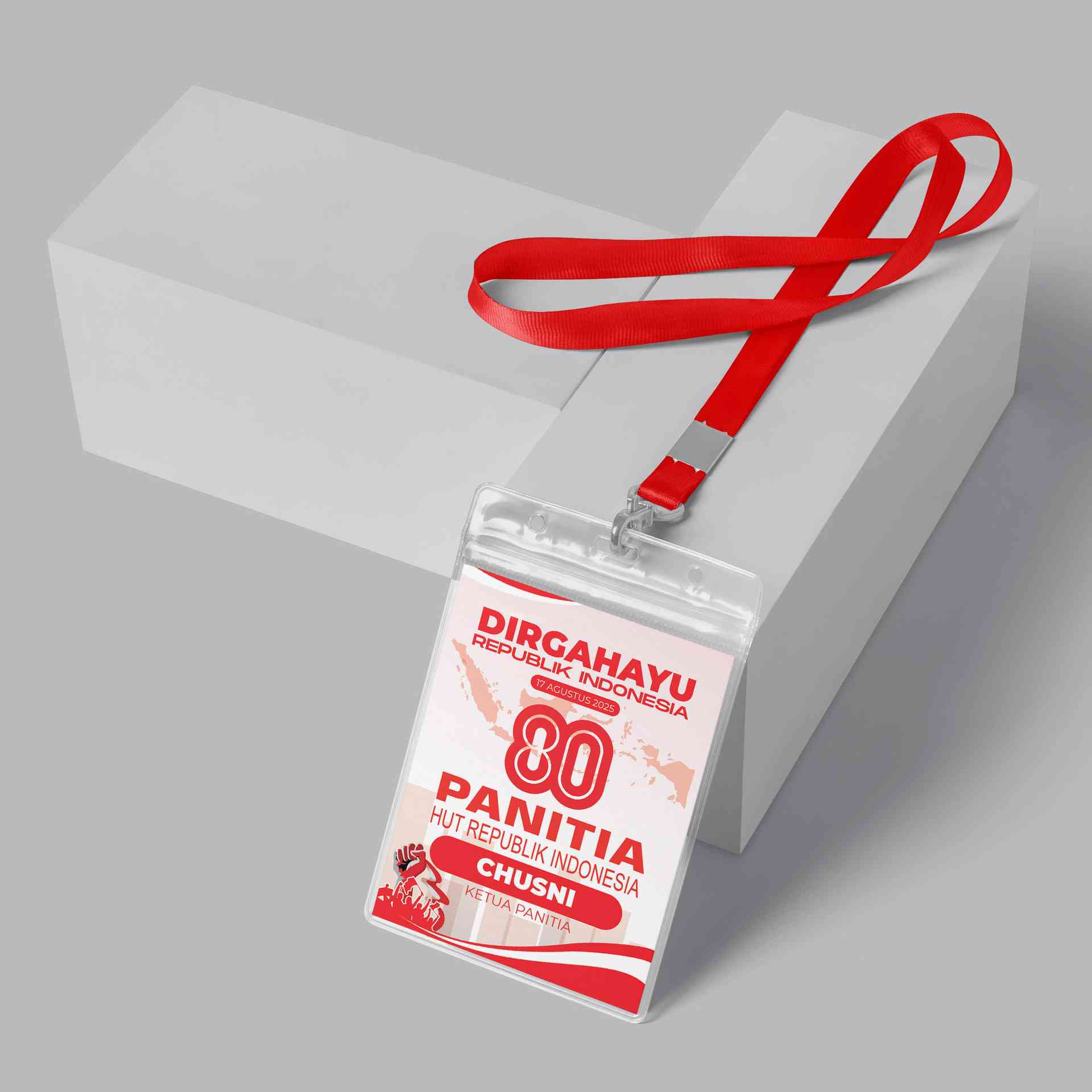 Id Card Panitia Kemerdekaan Merah Putih Bendera berbentuk persegi panjang dengan dominasi warna merah dan putih, menampilkan karakter visual angka 80...