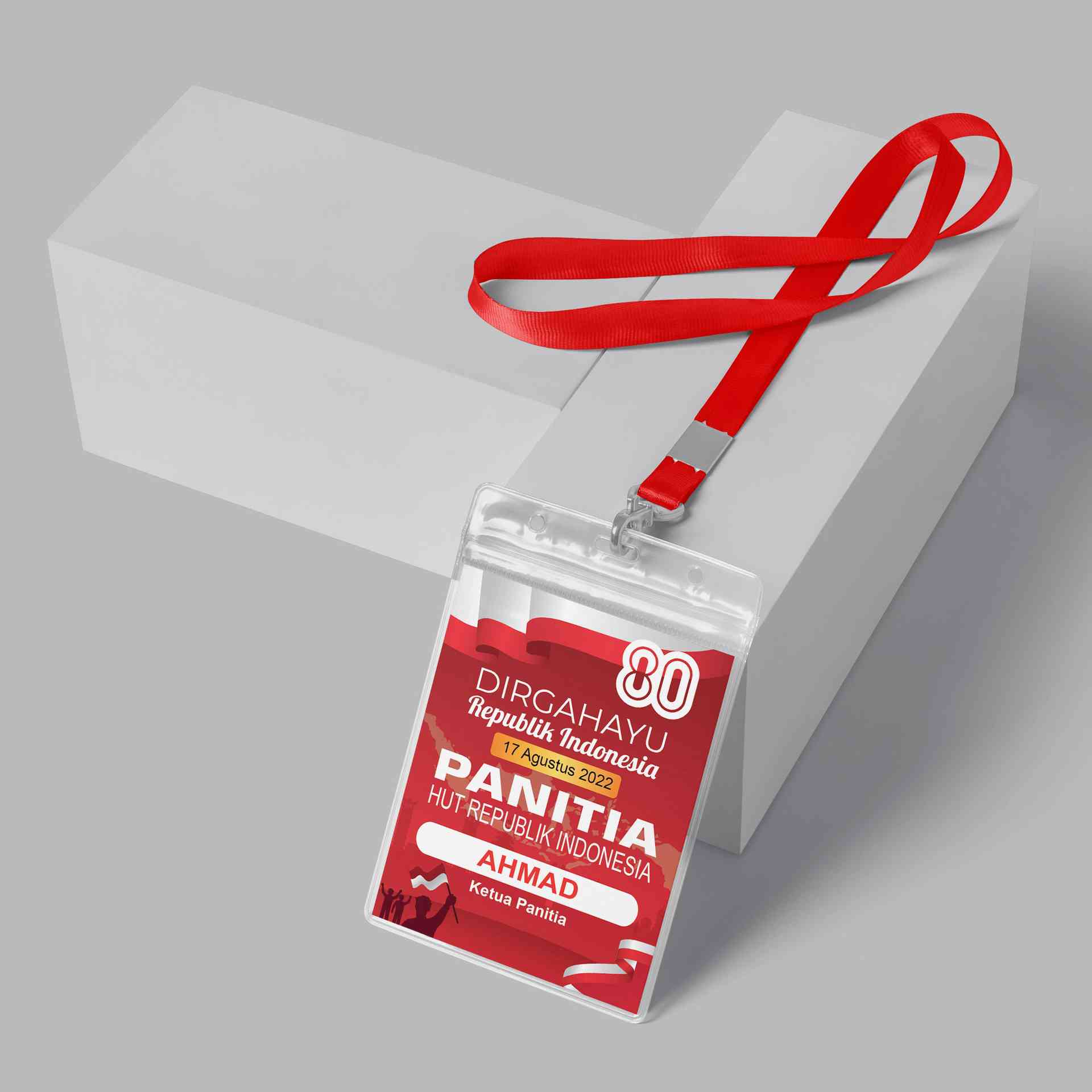 Id card Panitia Kemerdekaan 17 Agustus berbentuk persegi panjang vertikal dengan warna dominan merah dan putih, menggambarkan nuansa nasionalisme sesu...