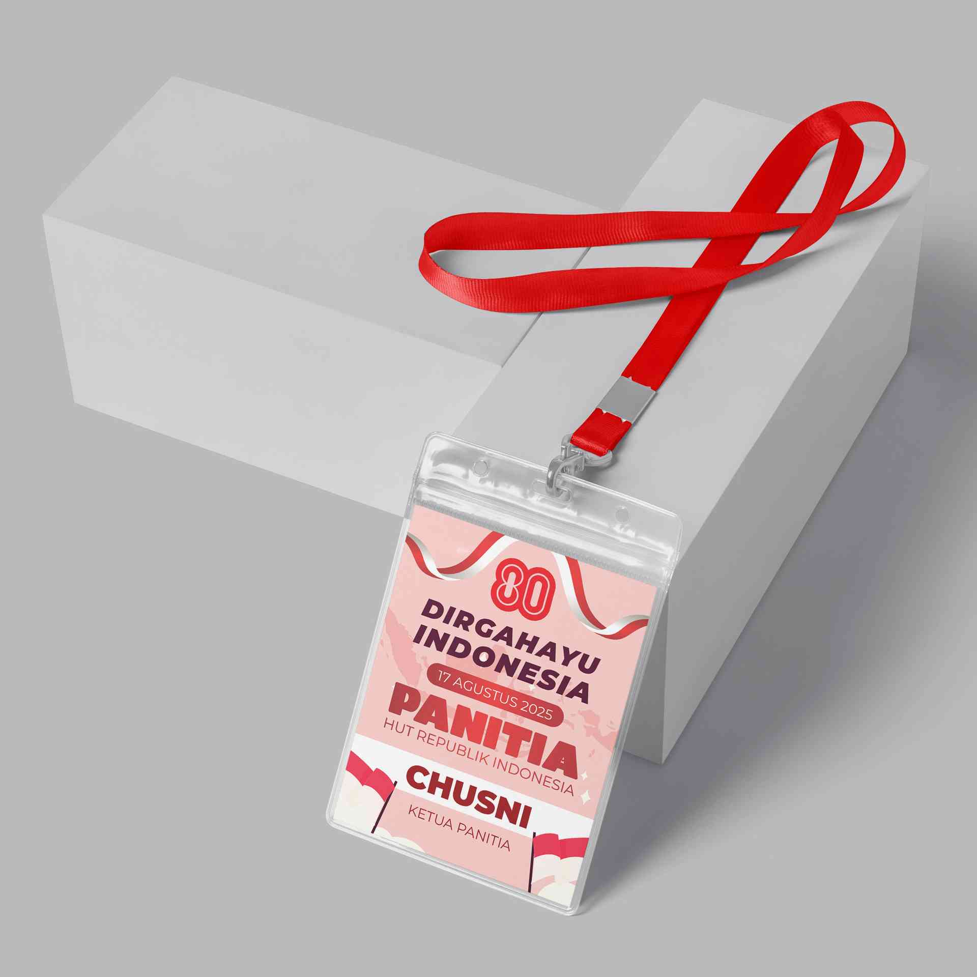 Id Card Panitia Kemerdekaan Merah Putih Pink Soft berbentuk persegi panjang vertikal dengan dominasi warna merah, putih, dan pink. Desain visual menco...