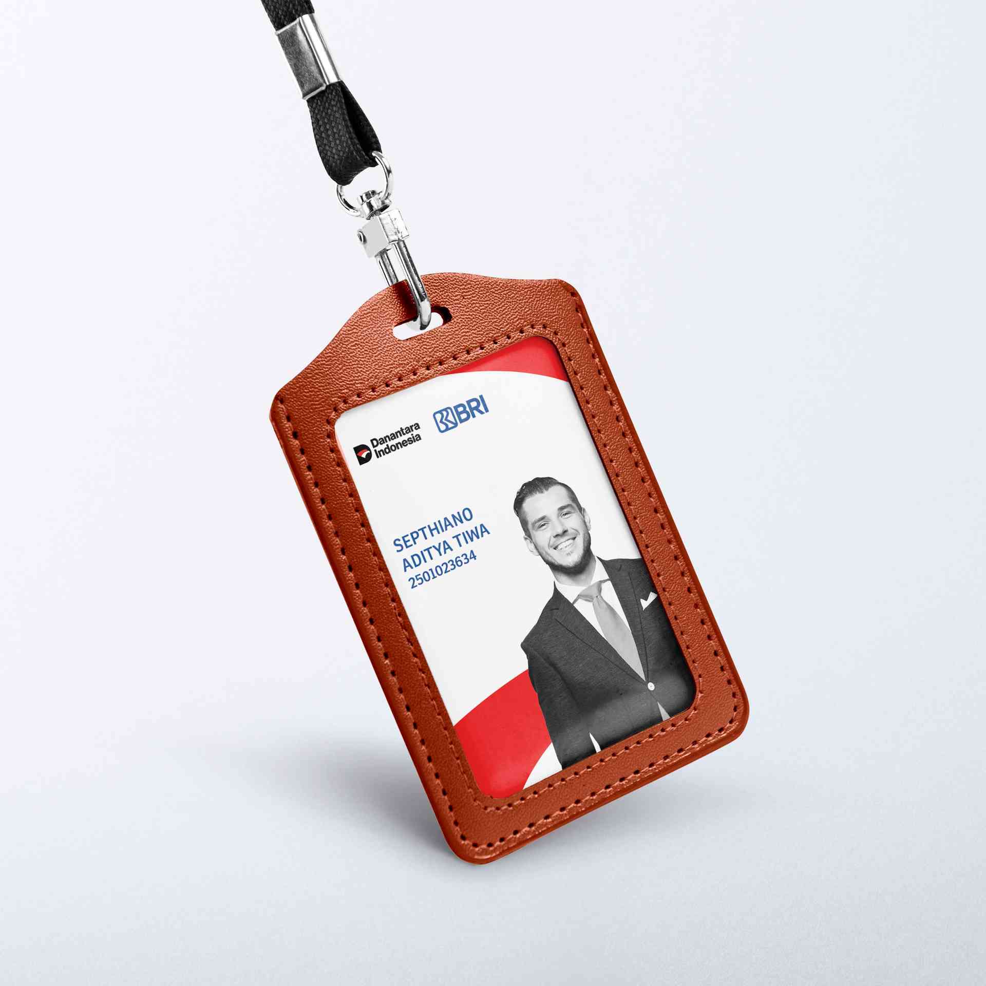ID Card perusahaan dengan dominasi warna biru tua menampilkan foto dan identitas pemilik secara jelas, disertai elemen visual berupa logo BUMN dan Per...