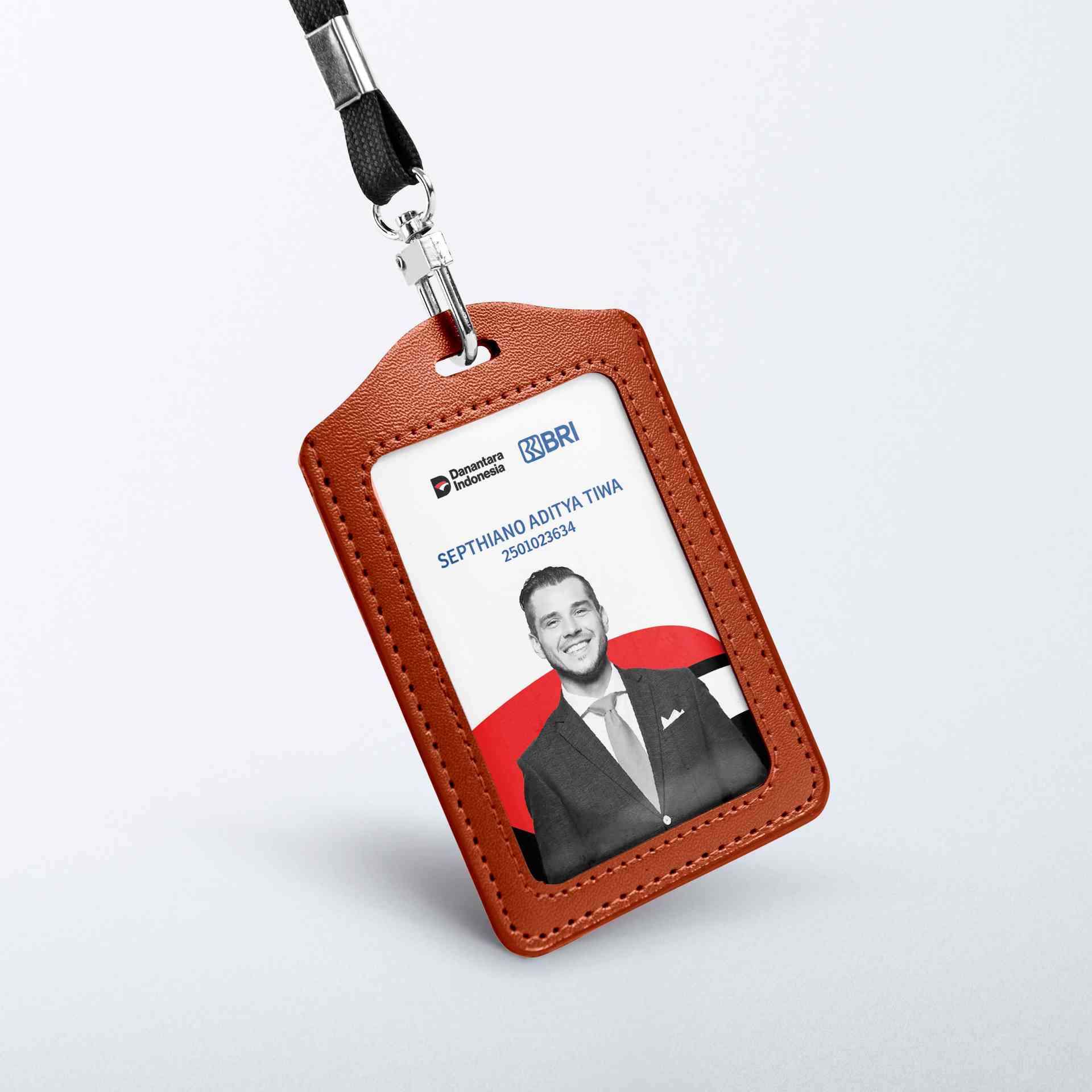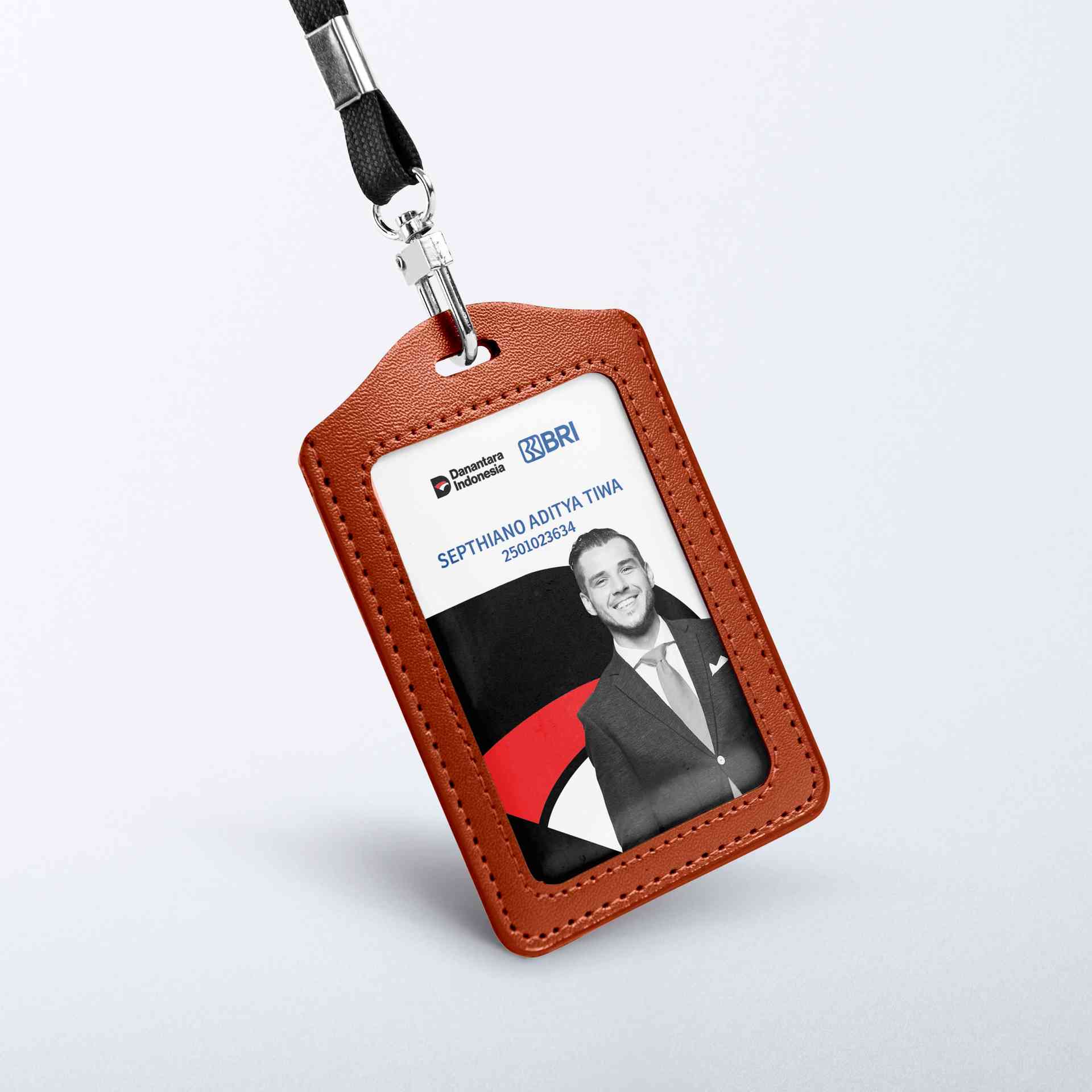 ID Card perusahaan dengan dominasi warna biru tua menampilkan foto dan identitas pemilik secara jelas, disertai elemen visual berupa logo BUMN dan Per...