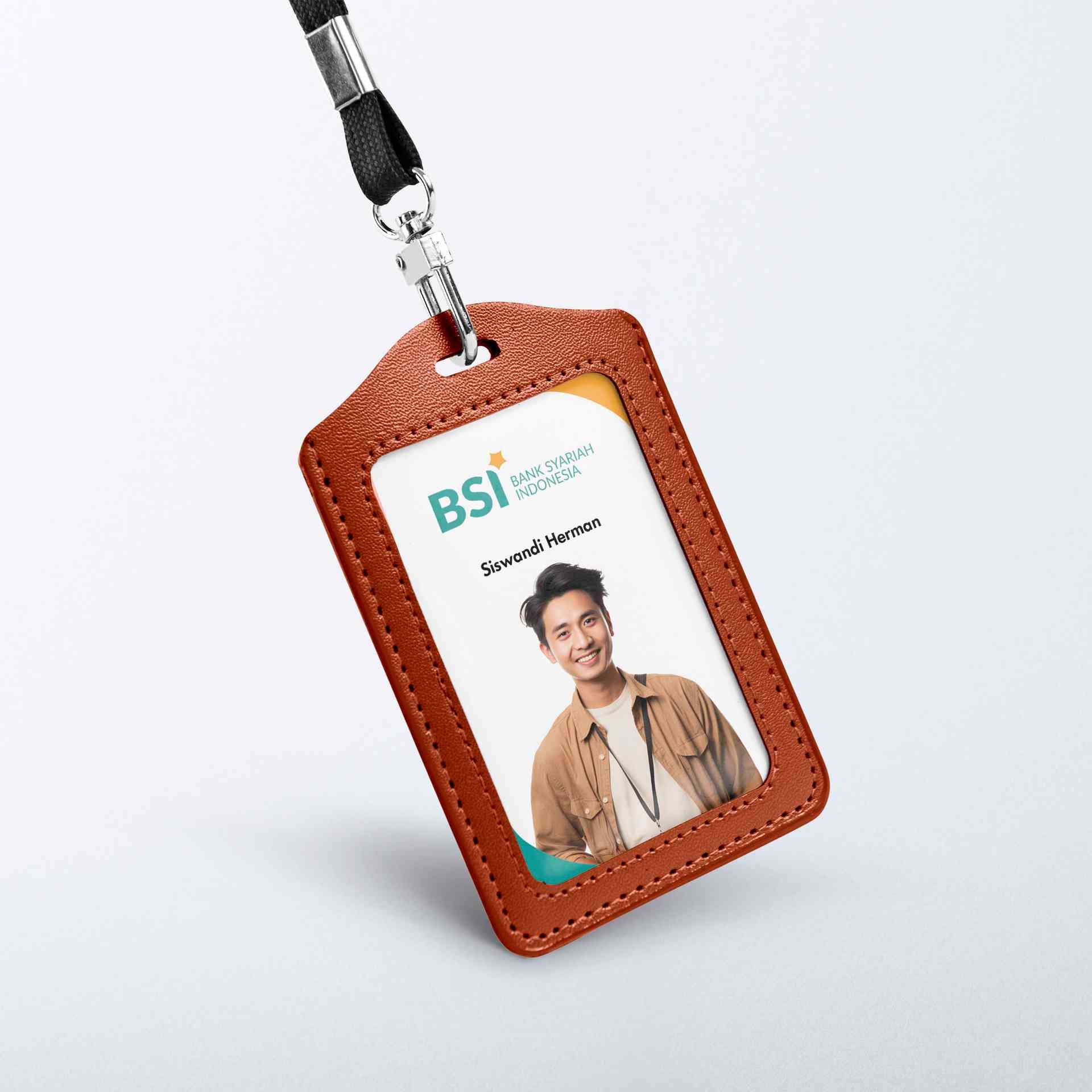 ID Card perusahaan berformat persegi panjang dengan latar putih dilengkapi hiasan hijau pada bagian bawah, menampilkan logo dan nama perusahaan “Bank...