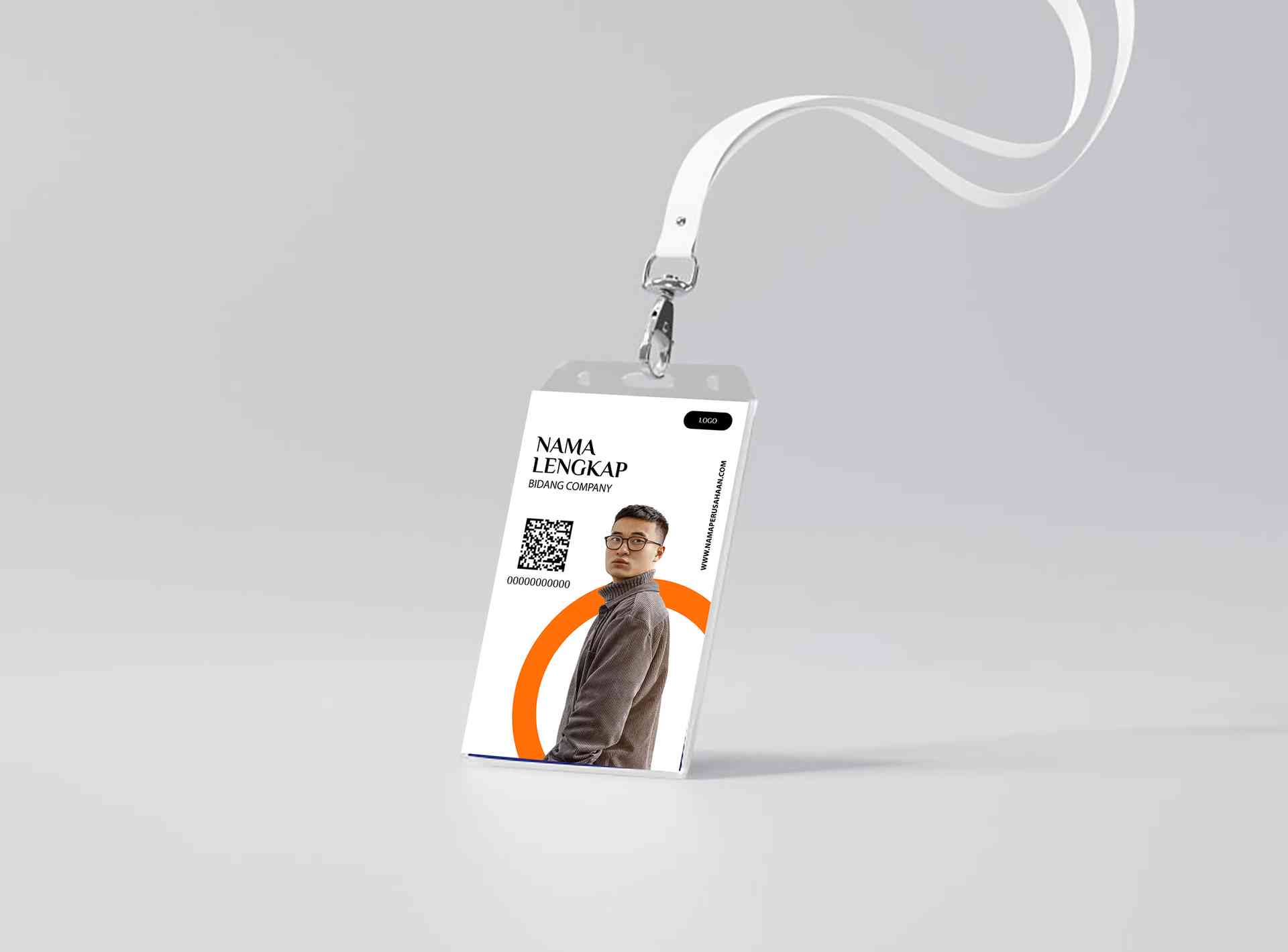 Desain ID card ini menggunakan kombinasi warna oranye dan putih yang klasik, menampilkan tulisan “COMPANY” di atas dengan font serif tegas. Nama lengkap tercetak jelas di tengah kartu di bawah foto close-up pemilik ID, sedangkan valid date dan barcode berada di bawah untuk memudahkan penggunaan saat absensi atau akses masuk ruangan. Terdapat space logo di pojok atas sebagai branding perusahaan. Desain ini cocok digunakan oleh karyawan kantor, staff hotel, crew event, maupun organisasi formal yang mengutamakan desain profesional dan rapi.